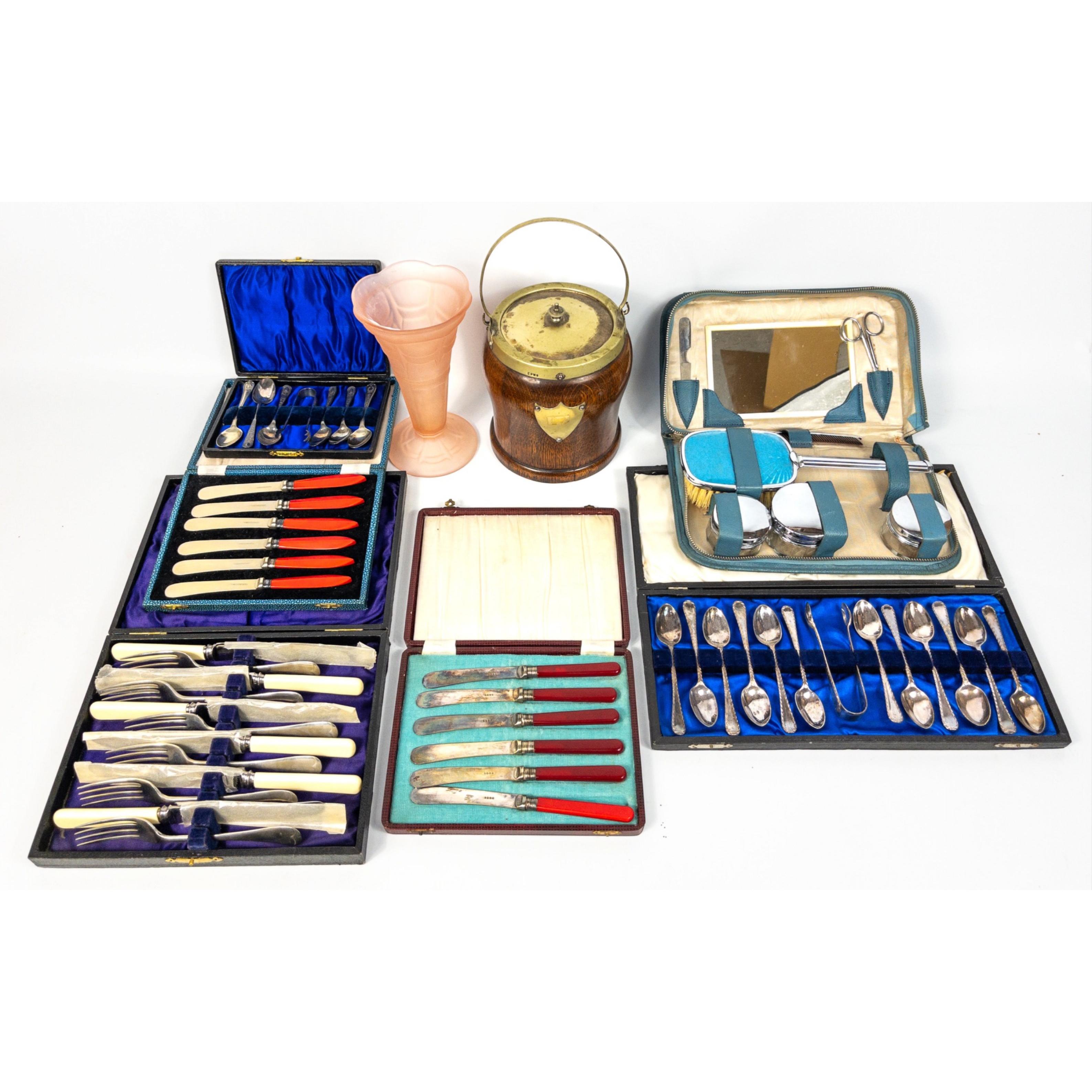A mixed lot box to include Carnival glass vase, vintage wooden biscuit barrel, a very attractive travelling hair care set in stainless steel with lovely blue engine turn enamel back to hairbrush and five boxed flatware cases.