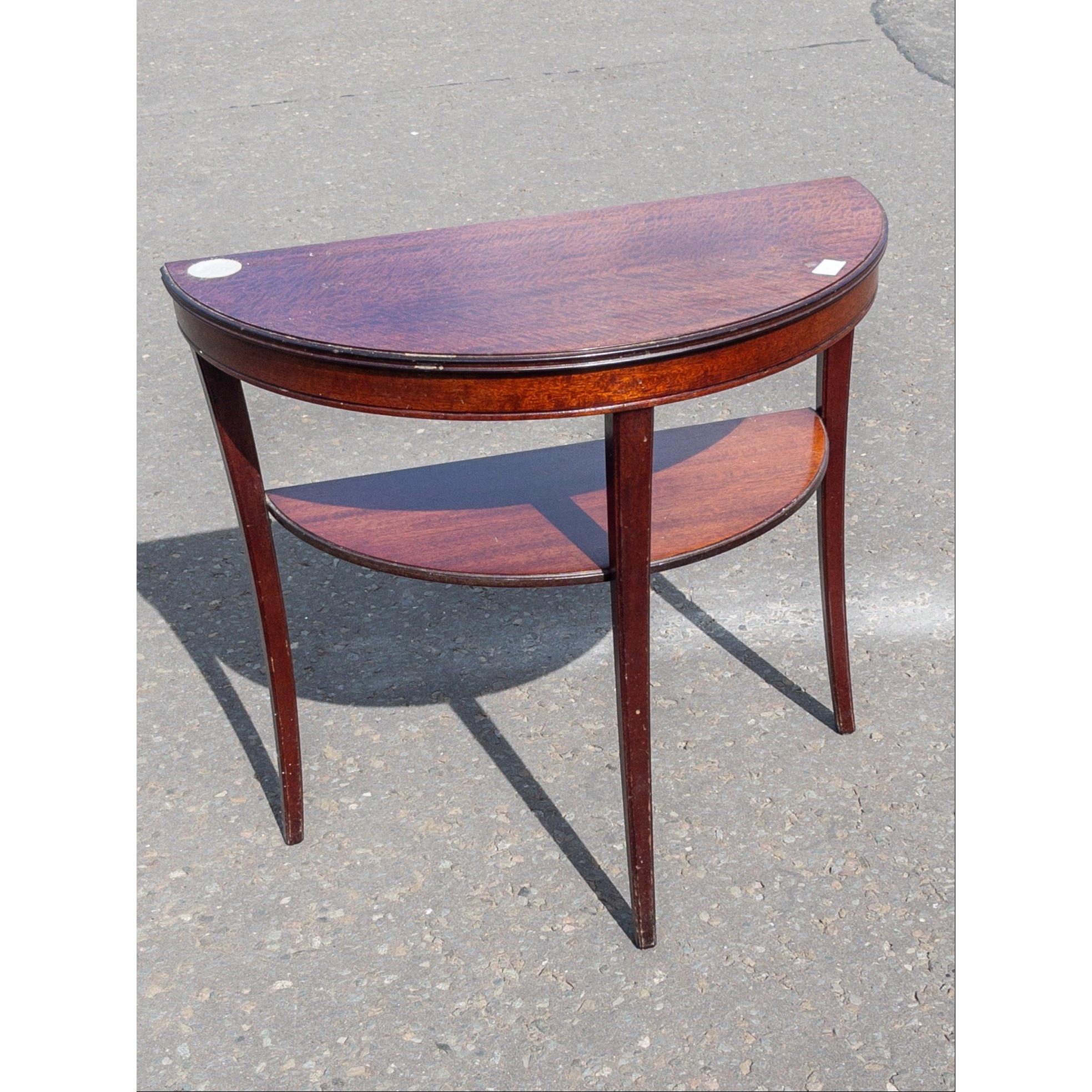 A dark wood demi-lune wall table with parcel shelf by Legate dimensions 77cm width x 38cm depth x 72cm height approx