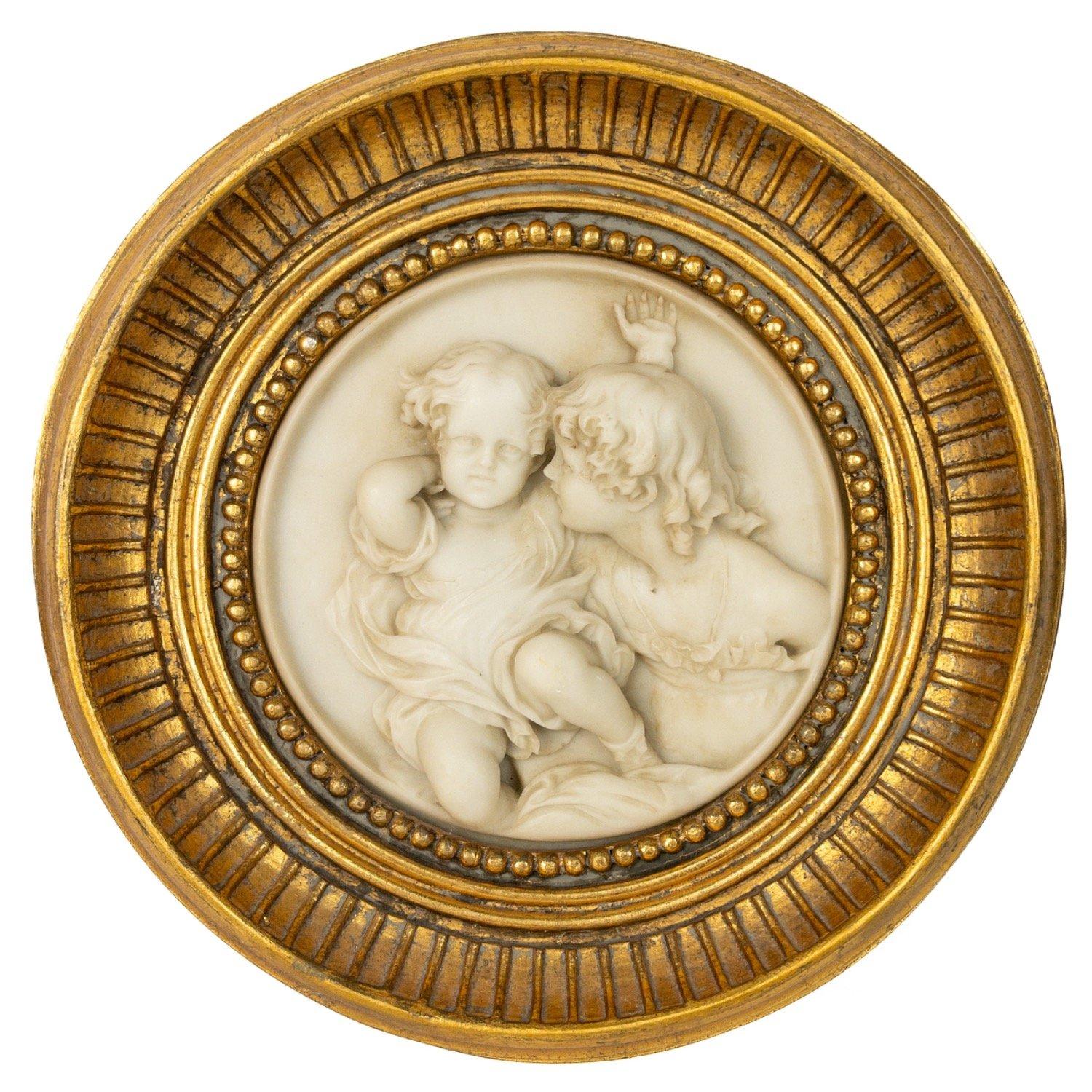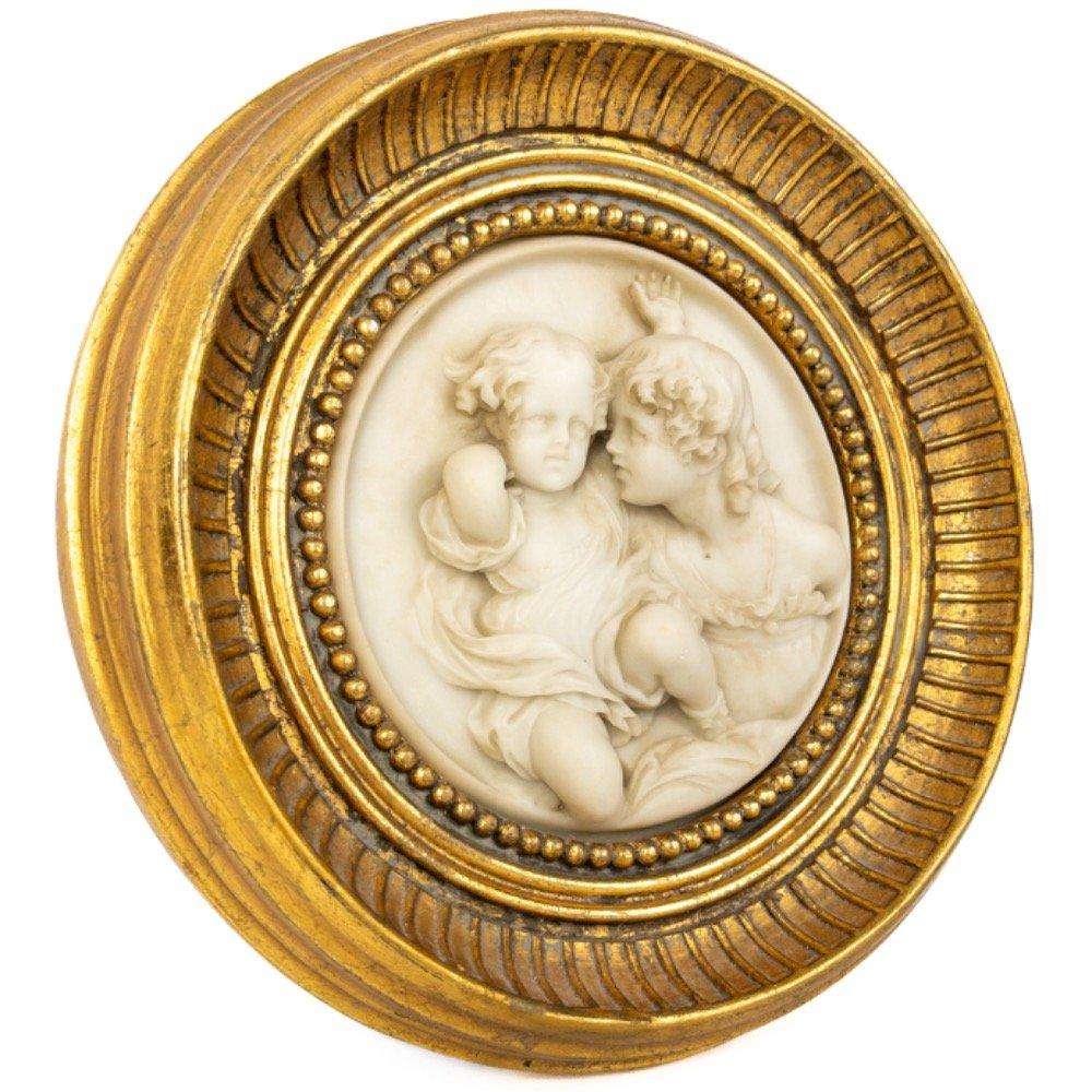 A circular 16cm diameter marble plaque in the manner of ENRICO BRAGA featuring two cherubs , both plaque and the gilt frame are in good condition , the frame has a diameter of 27cm and is ready to hang