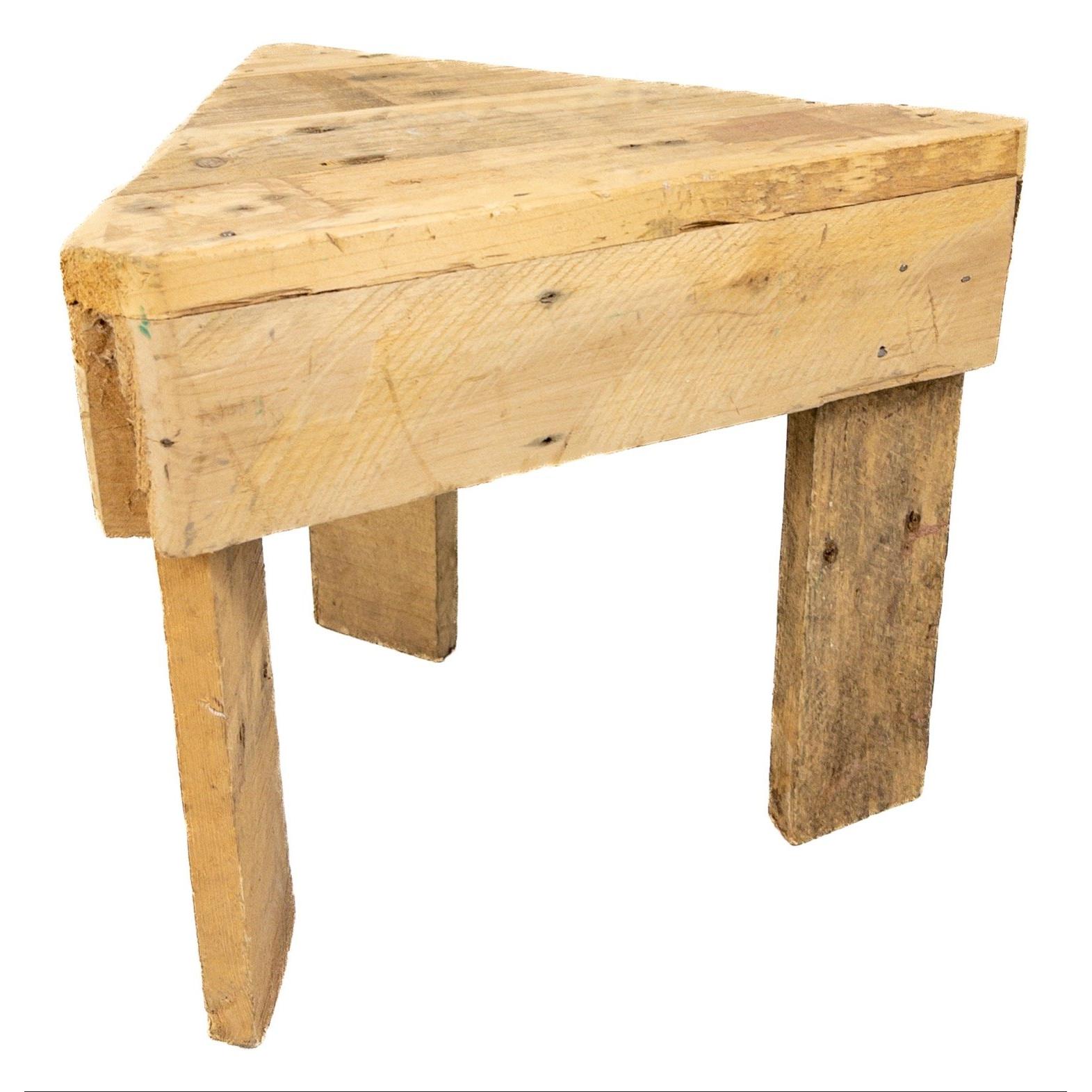 Cute small home made three corner workmans stool. Vendor made from crate to utilise in his workshop, a super little rustic item, great as a little corner stool or plant pot stand. 28cm high approx