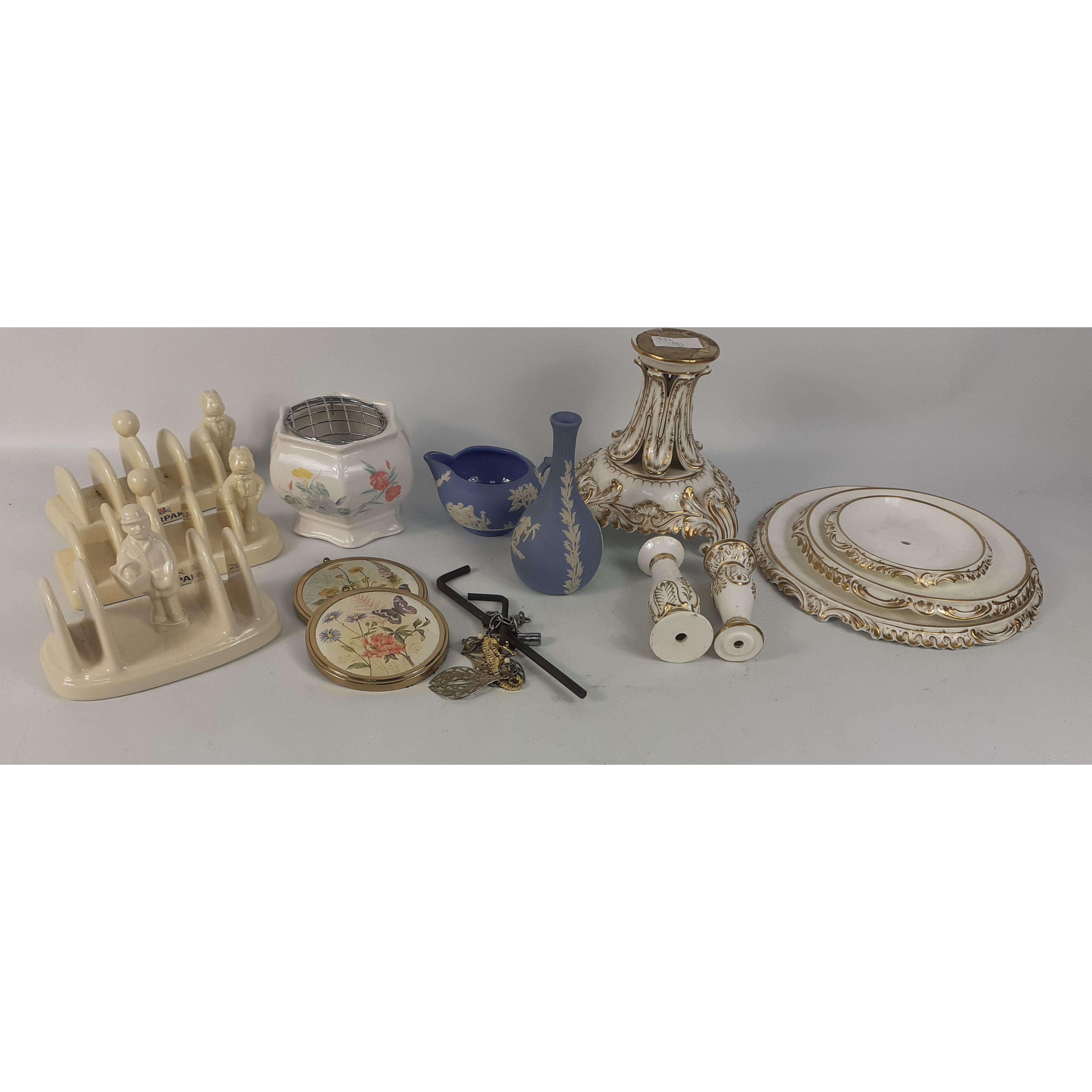 A mixed box of mostly ceramic items to include a three TIER CAKE STAND missing the handle , WADE TOASTRACKS one with a chip and unusual WEDGWOOD JASPER jug