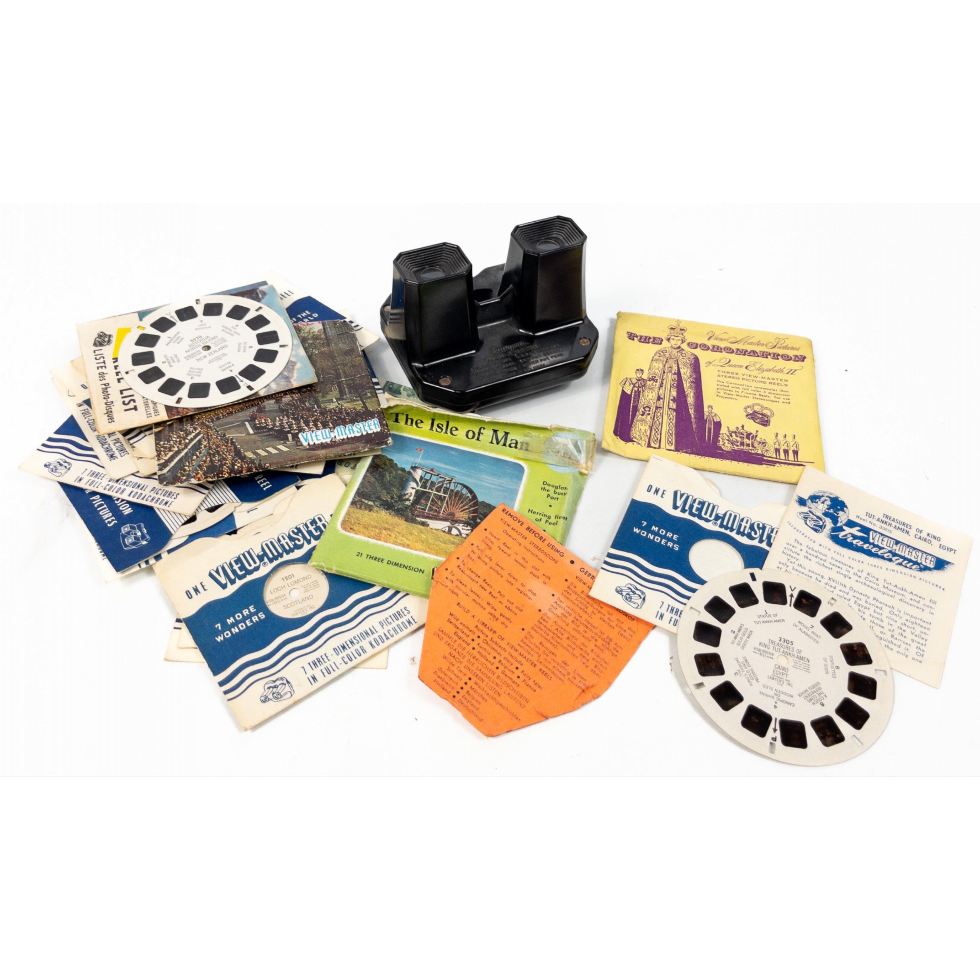 A SAWYERS View-Master Stereoscope with a selection of reels including THE CORONATION of QUEEN ELIZABTH and PRINCESS MARGARET'S WEDDING plus 20 reels including Loch Lomond, Basle New Zealand etcApprox 1 pieces