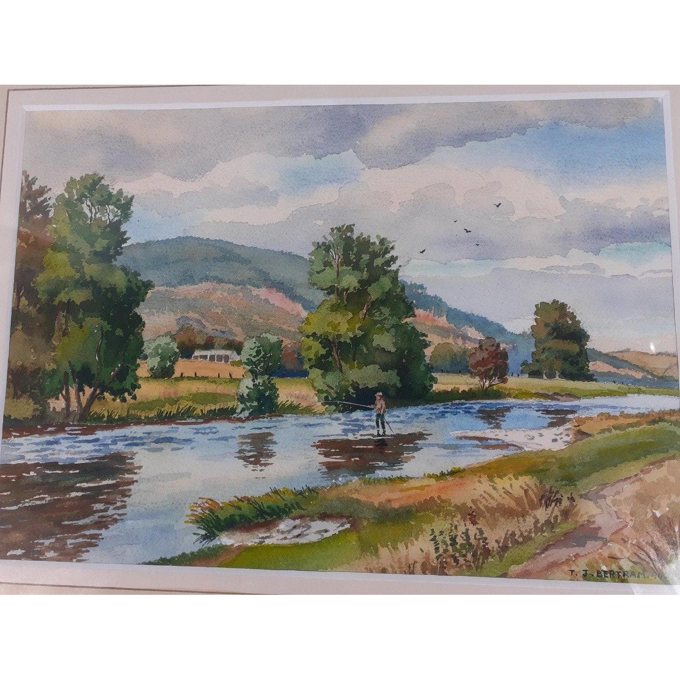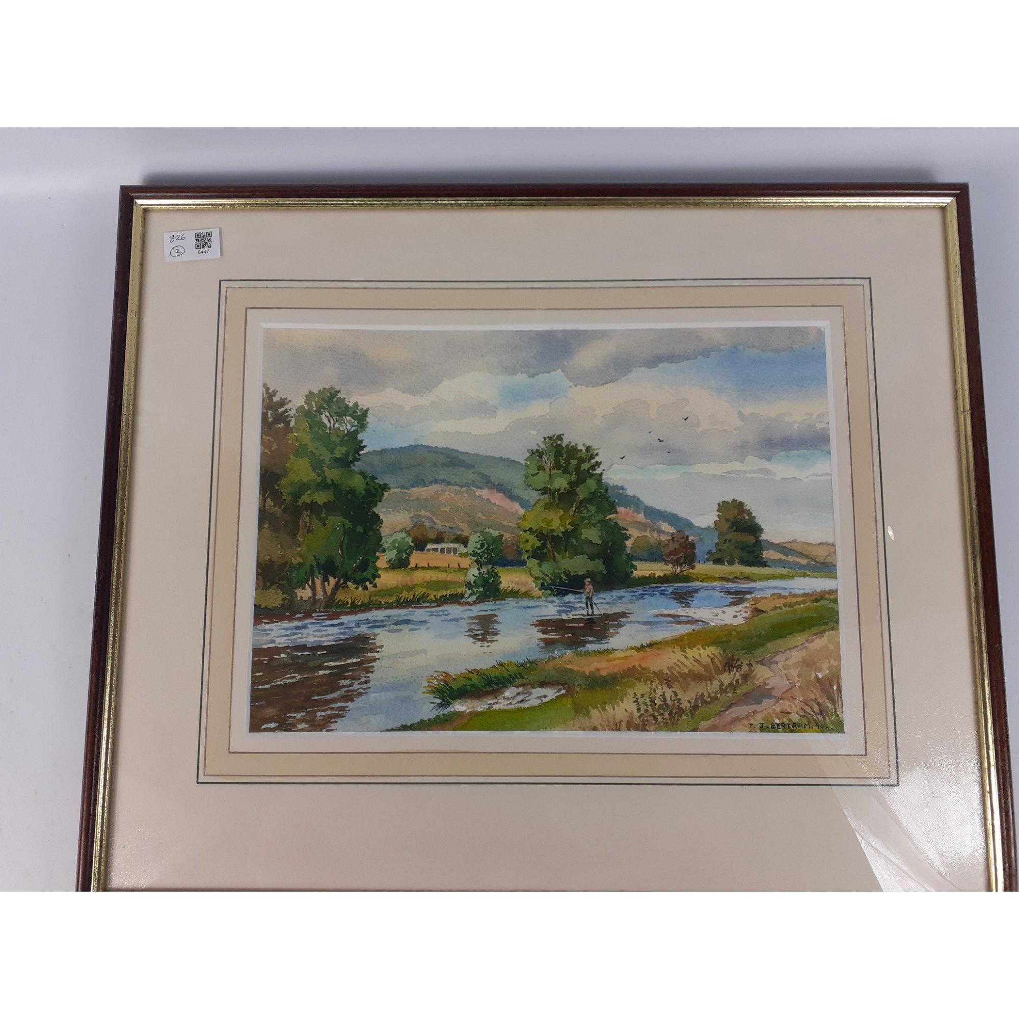 T.J.BERTRAM - Local Border artist. Original water colour dated 1994 and reputedly commissioned by request from the original owner who was a keen fisher man. Depicts a fisherman in the River Tweed at innerleithen. 58 x 48 cm approx including frame, actual art work size 38 x 27cm approx.
