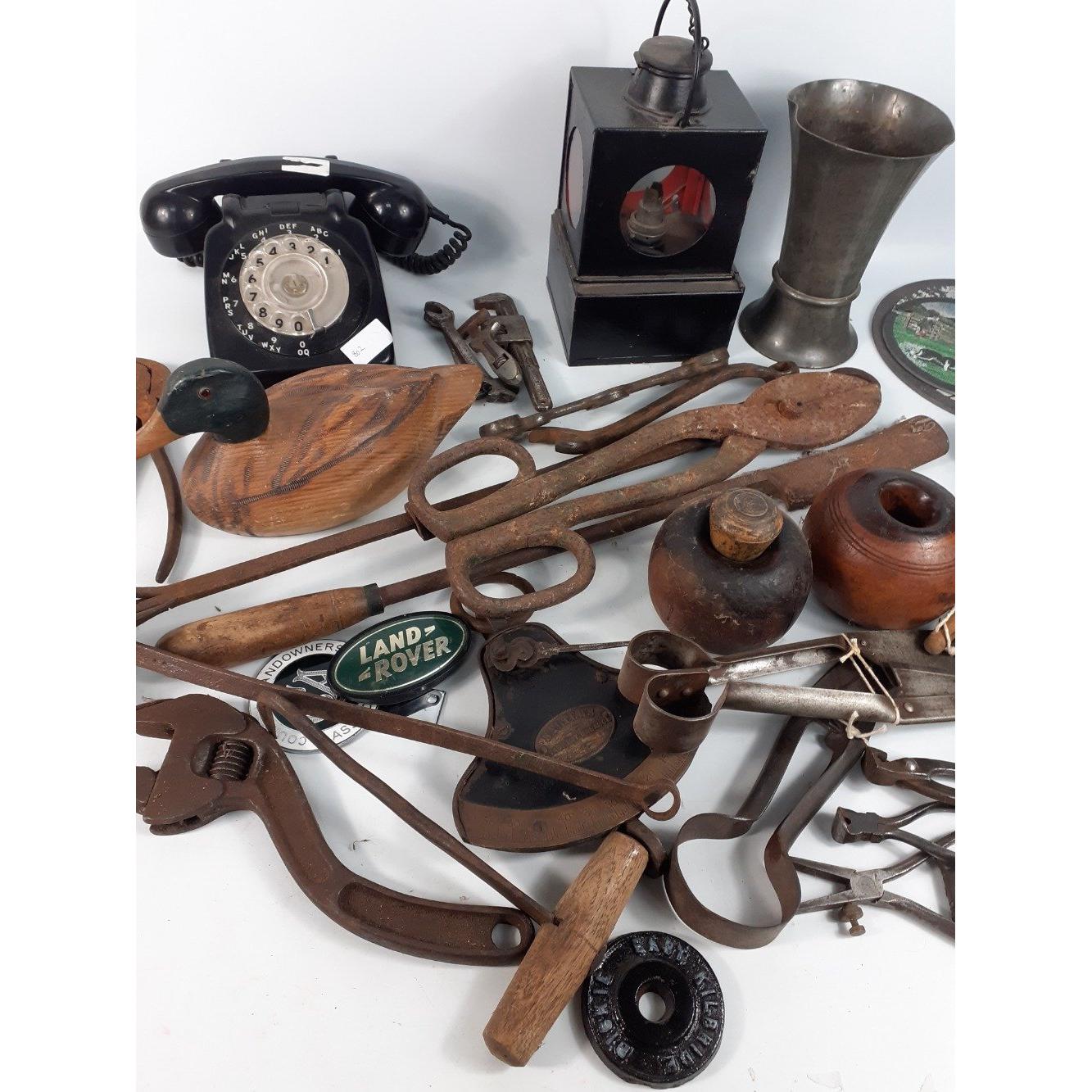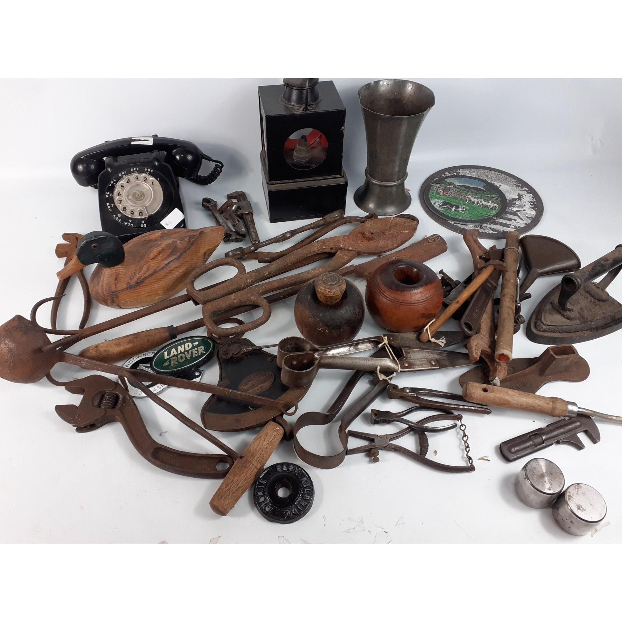 A Mixed box to include some vintage tools and vintage treen. Includes old BT rotary phone, English pewter vase, Salter balance scale, shears, wrenches, old Ford snail logo Tractor spanner, Flat iron, SEGS SAVE REPAIRS Cobblers advertising last etc. An interesting lot.