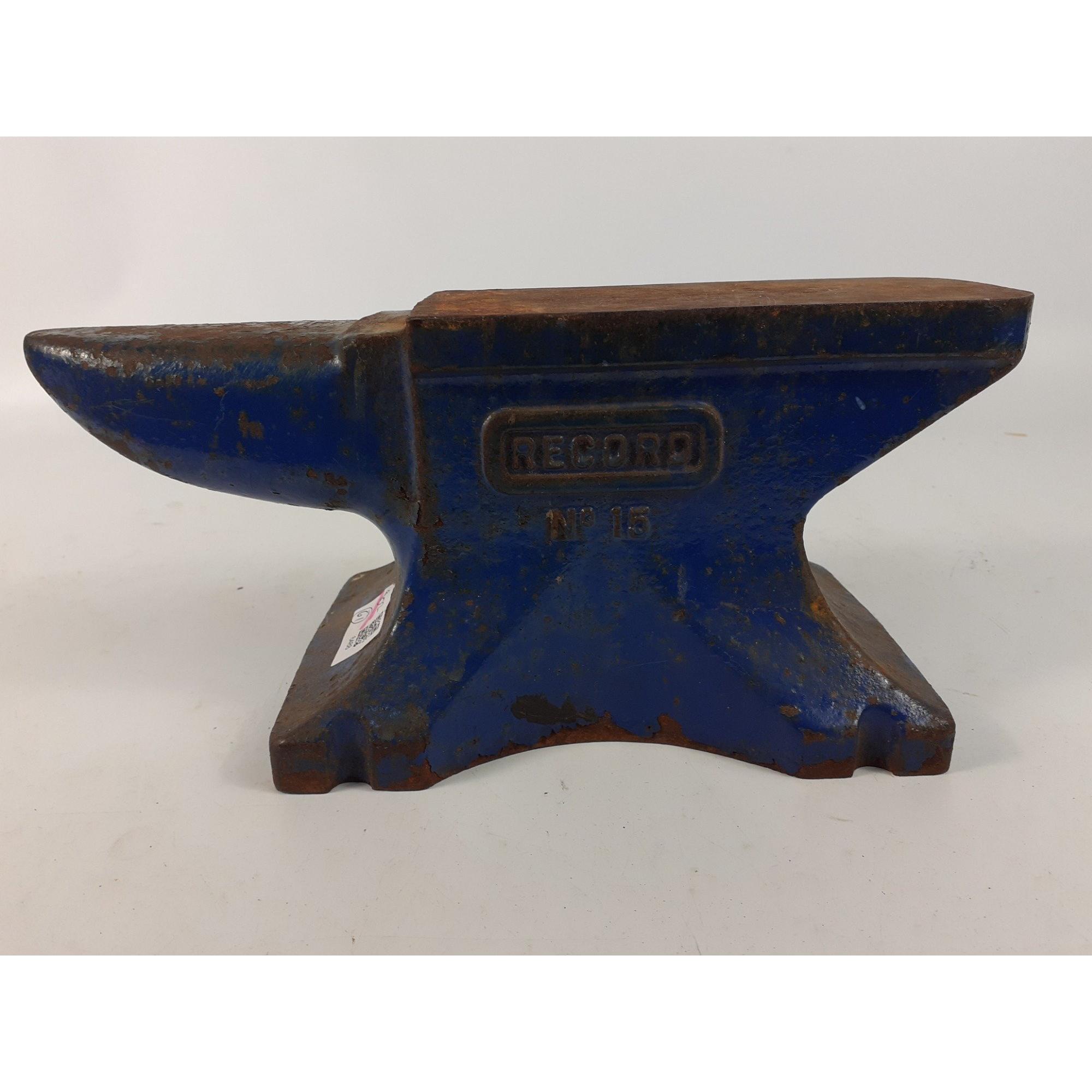 A Vintage small RECORD no. 15 anvil in blue. 30cm long approx. Surface rust in ares from use and storage