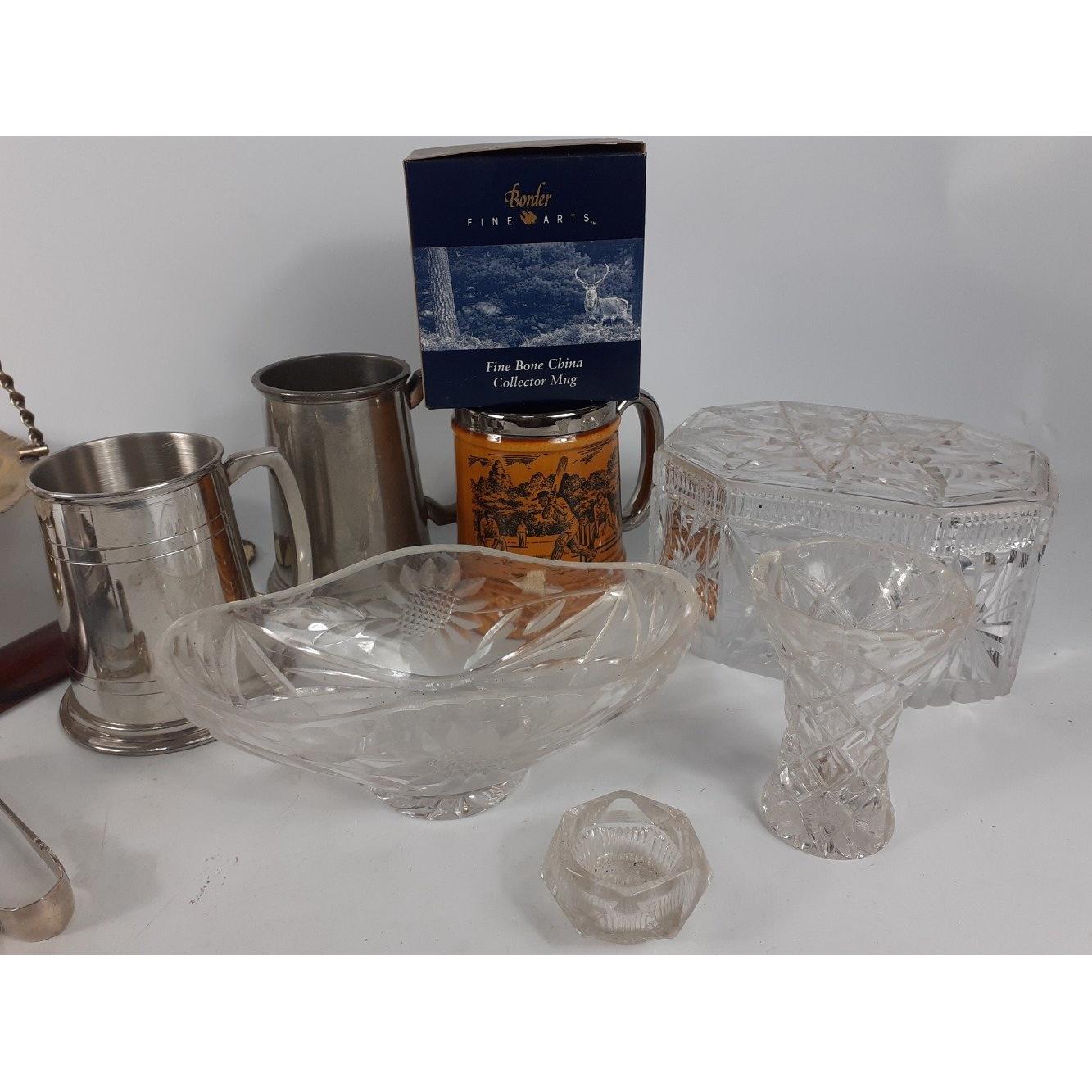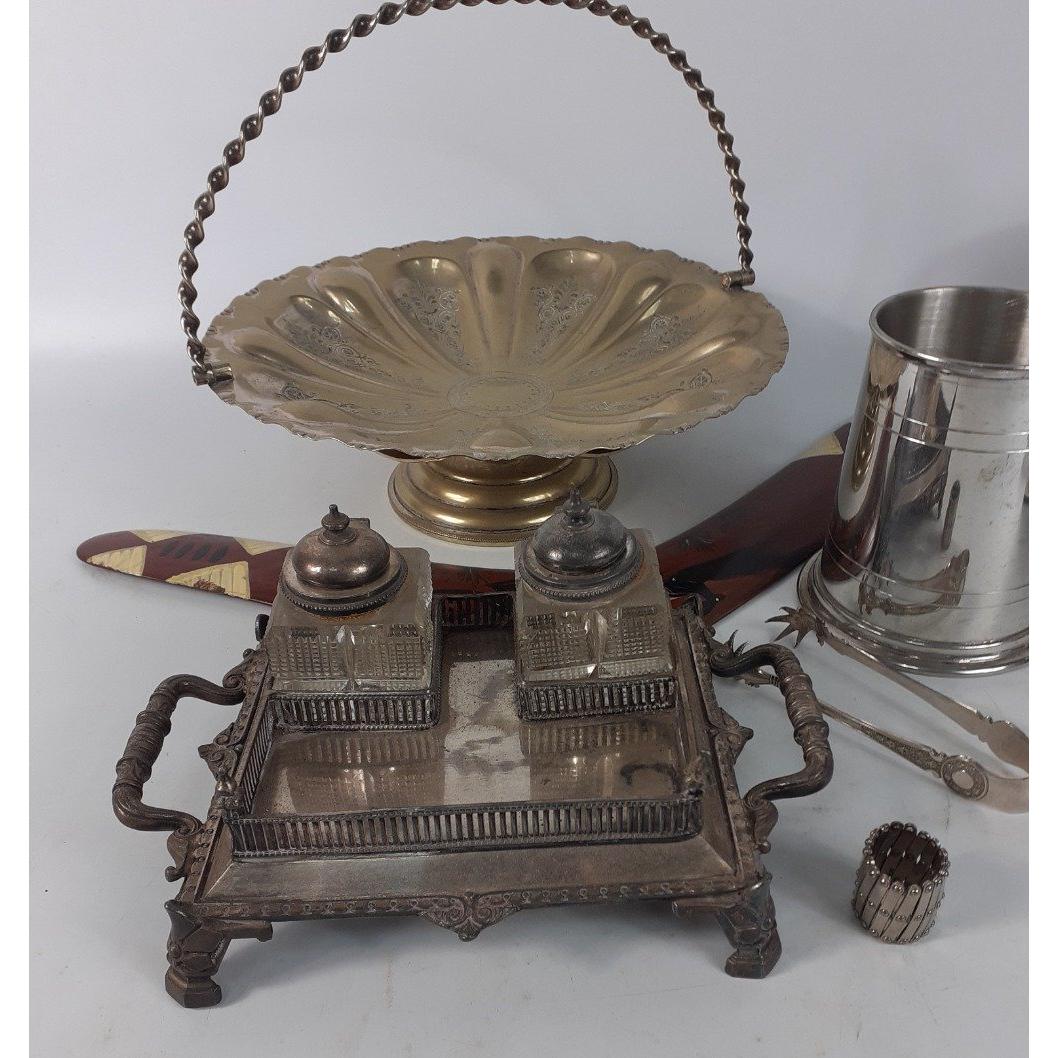A VINTAGE QUALITY! mixed lot to include an attractive EPNS ink well complete with square hinged ink wells by PHILIP ASHBERRY, a circular plated serving disc, two English Pewter tankards, a Cricket themed mug, a boomerang, glass box AF and others