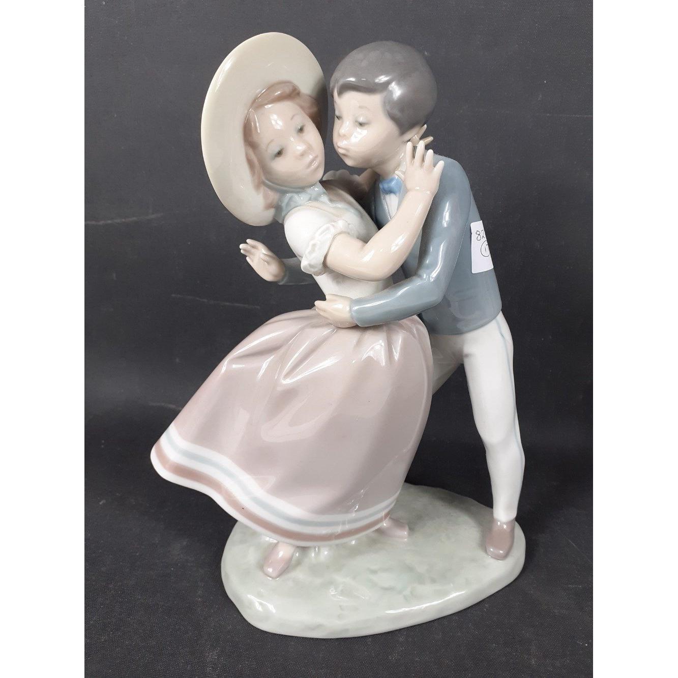 Two LLADRO groupings each of 2 children - one a boy trying to snatch a kiss from a girl and the other a boy playing the lute for a wee girl, no chips, cracks or visible damageApprox 2 pieces