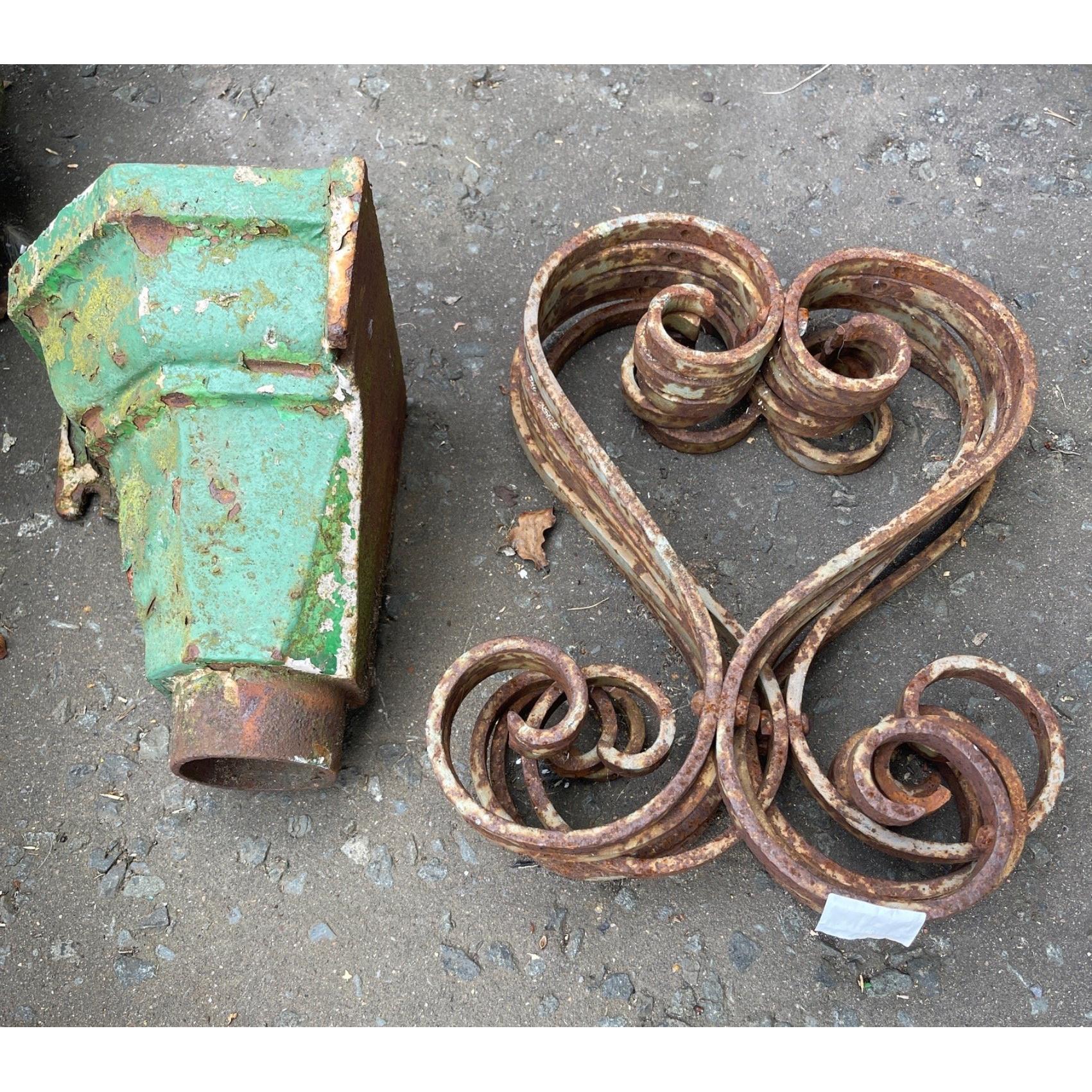 An ANTIQUE iron small corner gutter culvert 23cm height x 18cm width approx and 4 old ornate weathered iron brackets 31cm height x 24cm width approx Approx 5 pieces