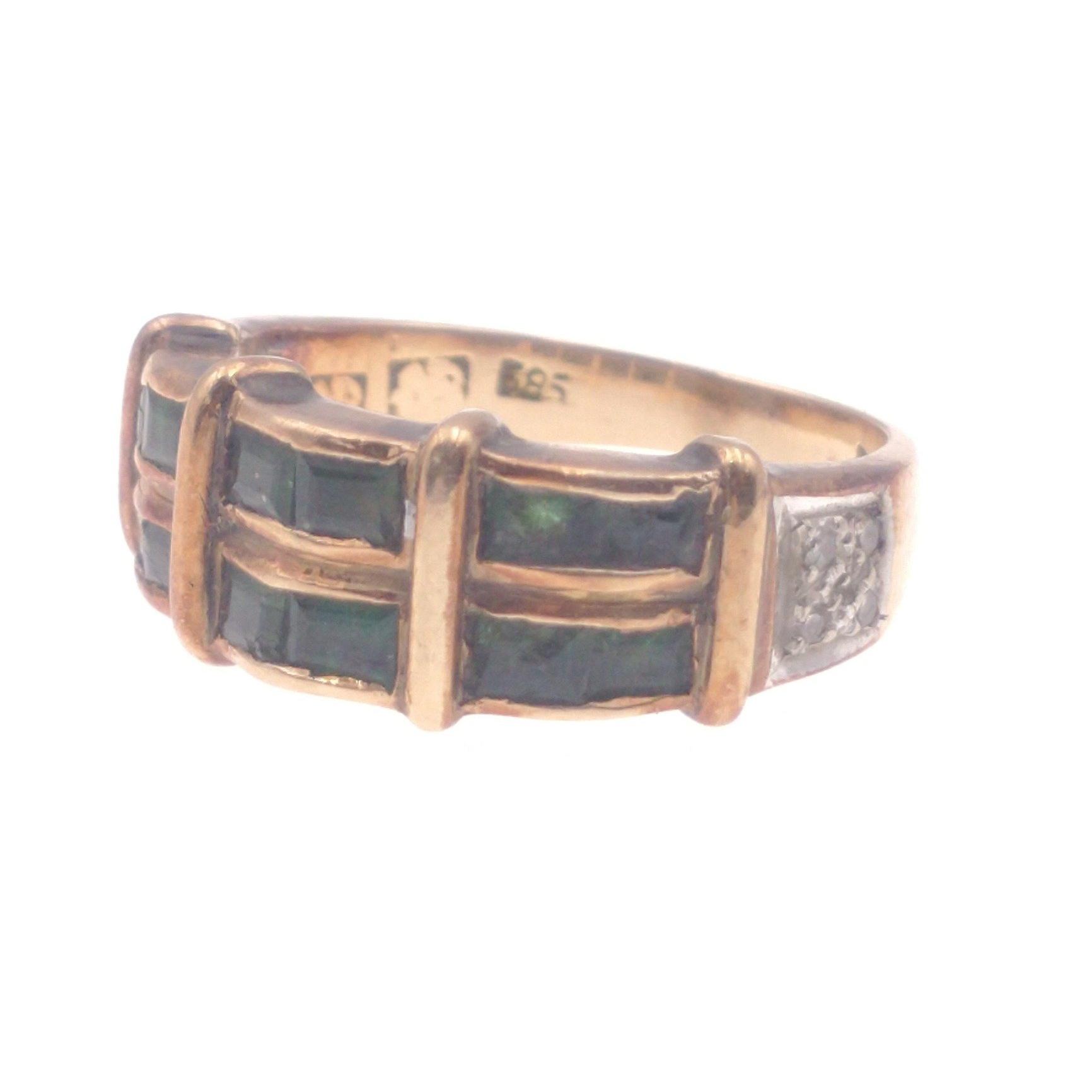 585 stamped yellow gold ring with six green emeralds ring size N gross weight 6.0g approx