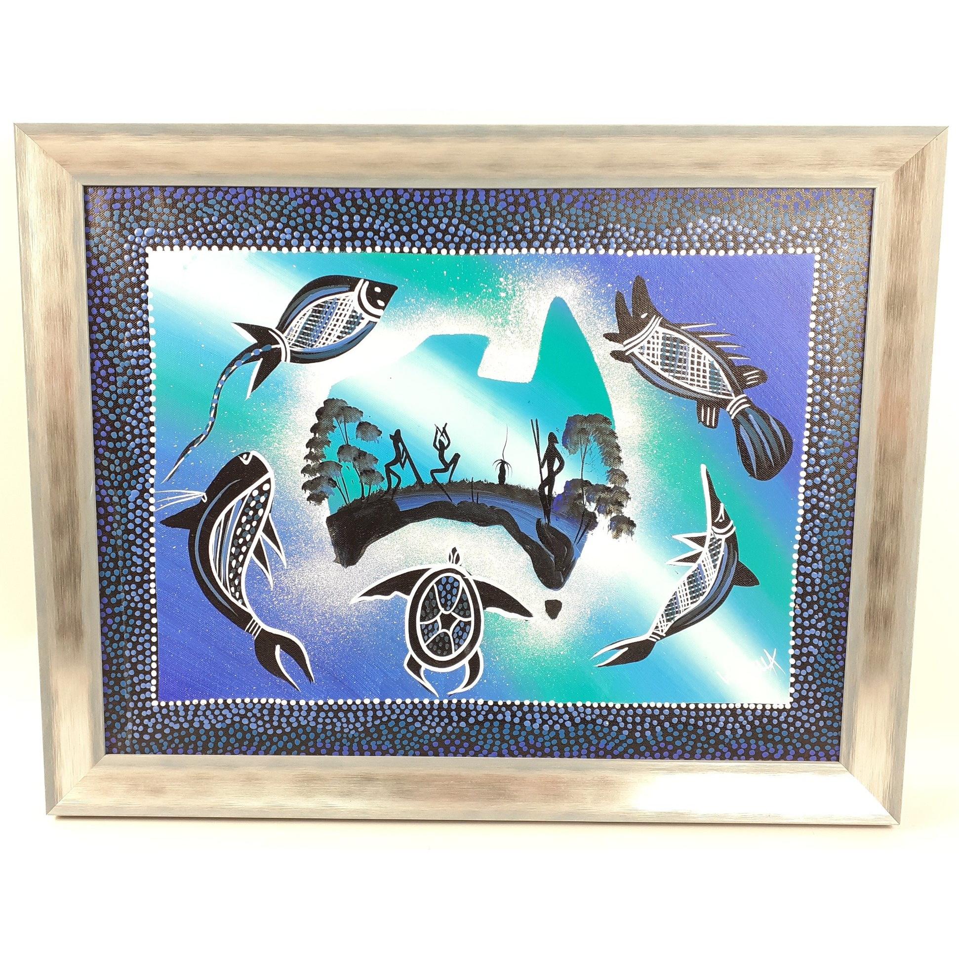 An Original Aboriginal Work of Art in a blue background depicting aquatic animals and local tribesmen by WINJELLA 26" x 20.5 height approxApprox 1 pieces