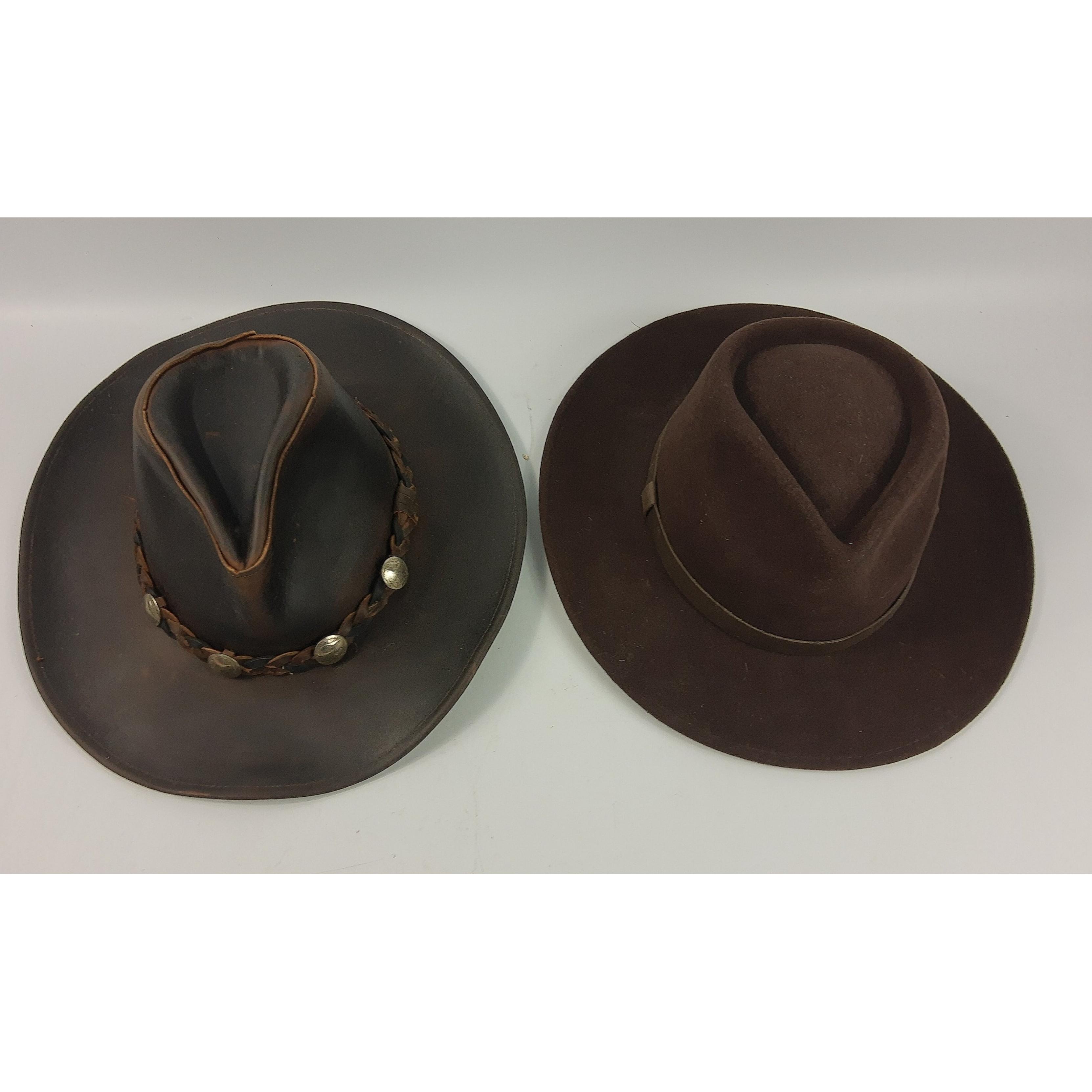 A brown leather cowboy hat from the HENSCHEL HAT CO of the USA , size medium (7-7 1/8) and a brown wool felt fedora size mediumApprox 2 pieces