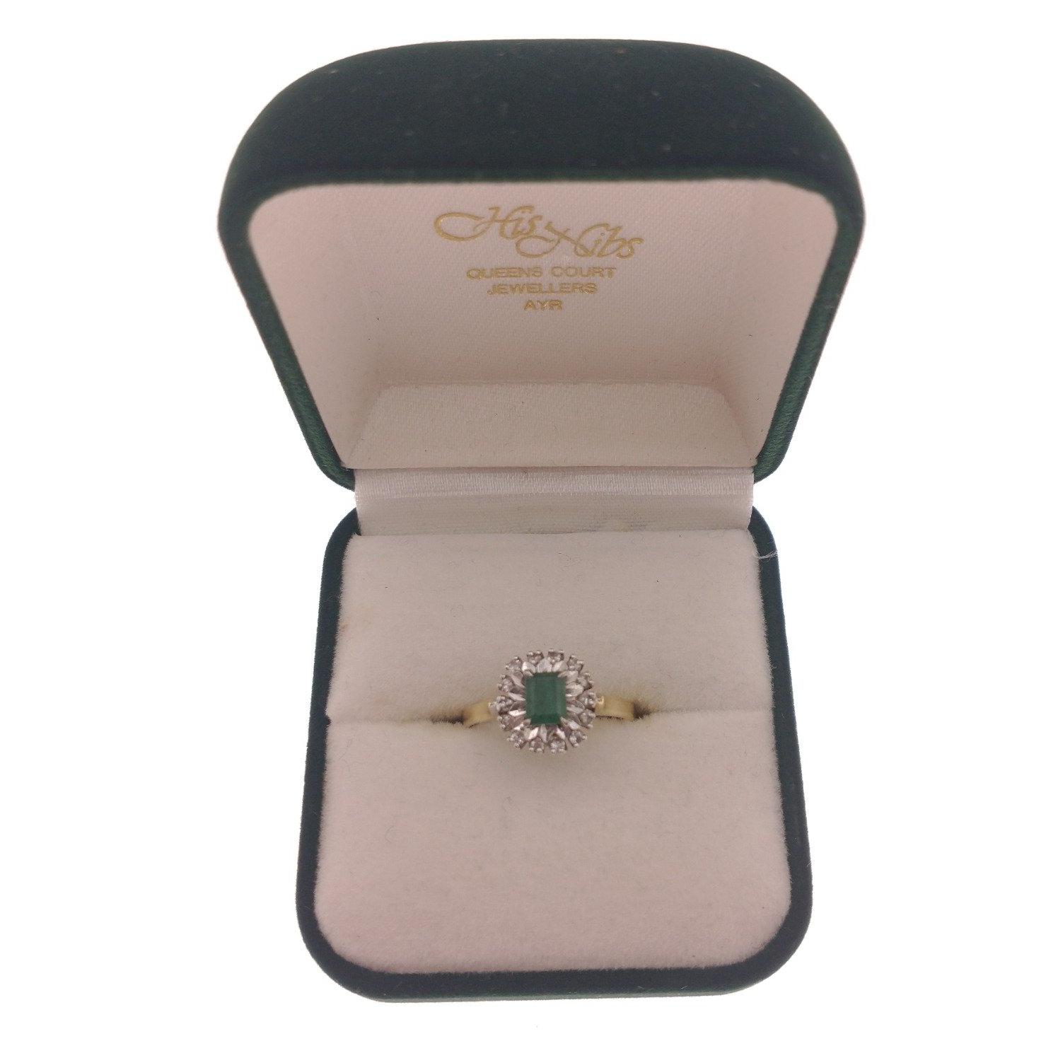 An 18k stamped yellow gold rectangular cut EMERALD centred ring, size P gross weight 3.07g approx