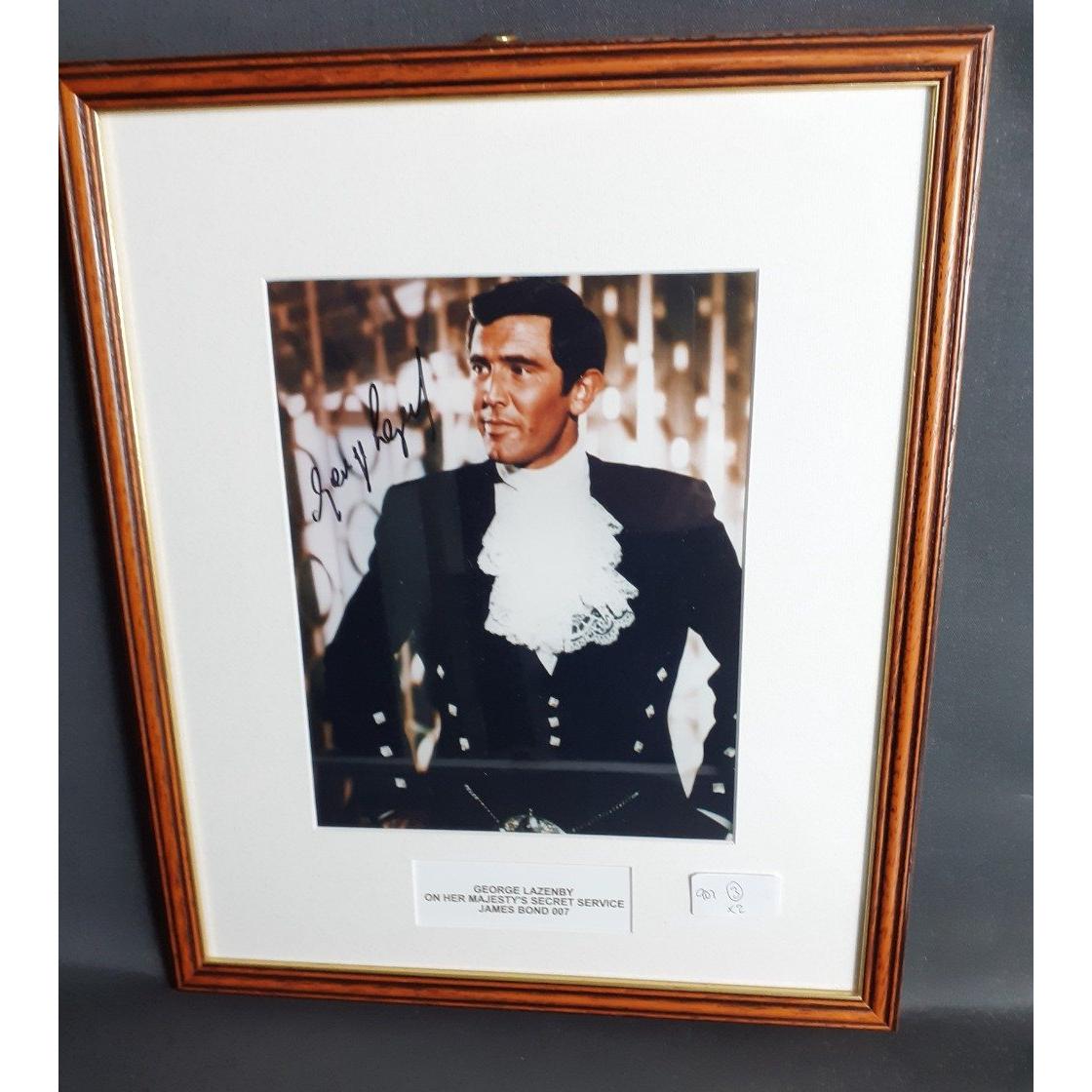 Two framed photos the first signed by George Lazenby 41cm x 35cm, also Roger Moore and Christopher Lee authentic signatures Christopher Lee and Roger Moore certified 12/10/02 and also The Man With The Golden Gun signed and certified signatures with certificate fixed verso - framed 39cm x 62cm