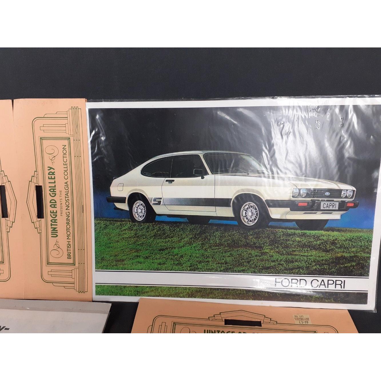 A collection of VINTAGE AD GALLERY British Nostalgia Collection to include models of cars The Escort Mexico, Ford Anglia from the '67 Motorshow, Escort 1300E, Ford Capri and Ford Probe - x5 qty - dimensions each 30cm x 45cm