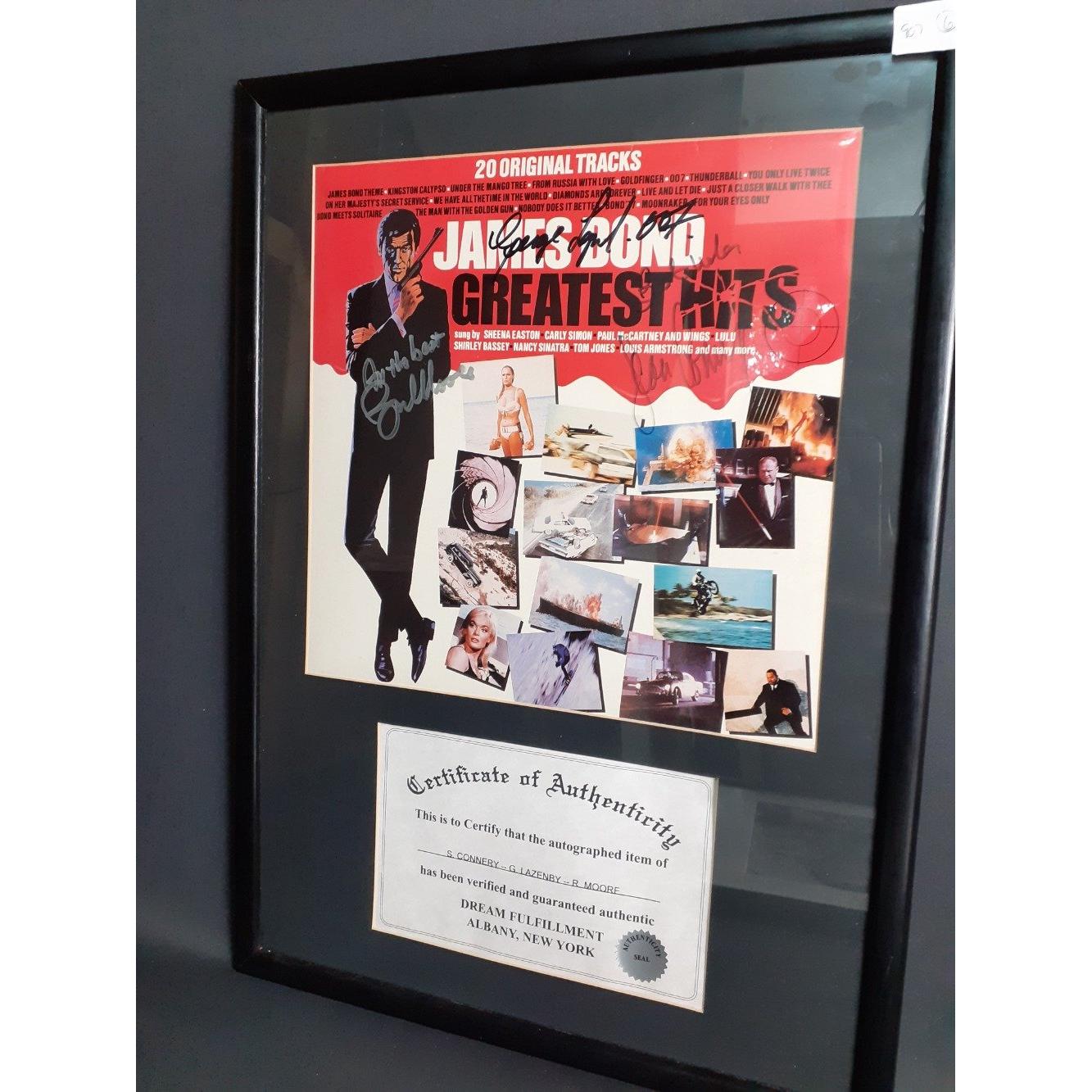 A framed picture personally signed by JAMES BOND 007 Roger Moore and Sean Connery with certificates of authenticity attached verso - 24cm high x 20cm width each photo, frame 60cm x 40cm approx, also a framed James Bond greatest hits album cover signed by Sean Connery, George Lazenby and Roger Moore (frame 57x42cm) comes with certificate of authenticity