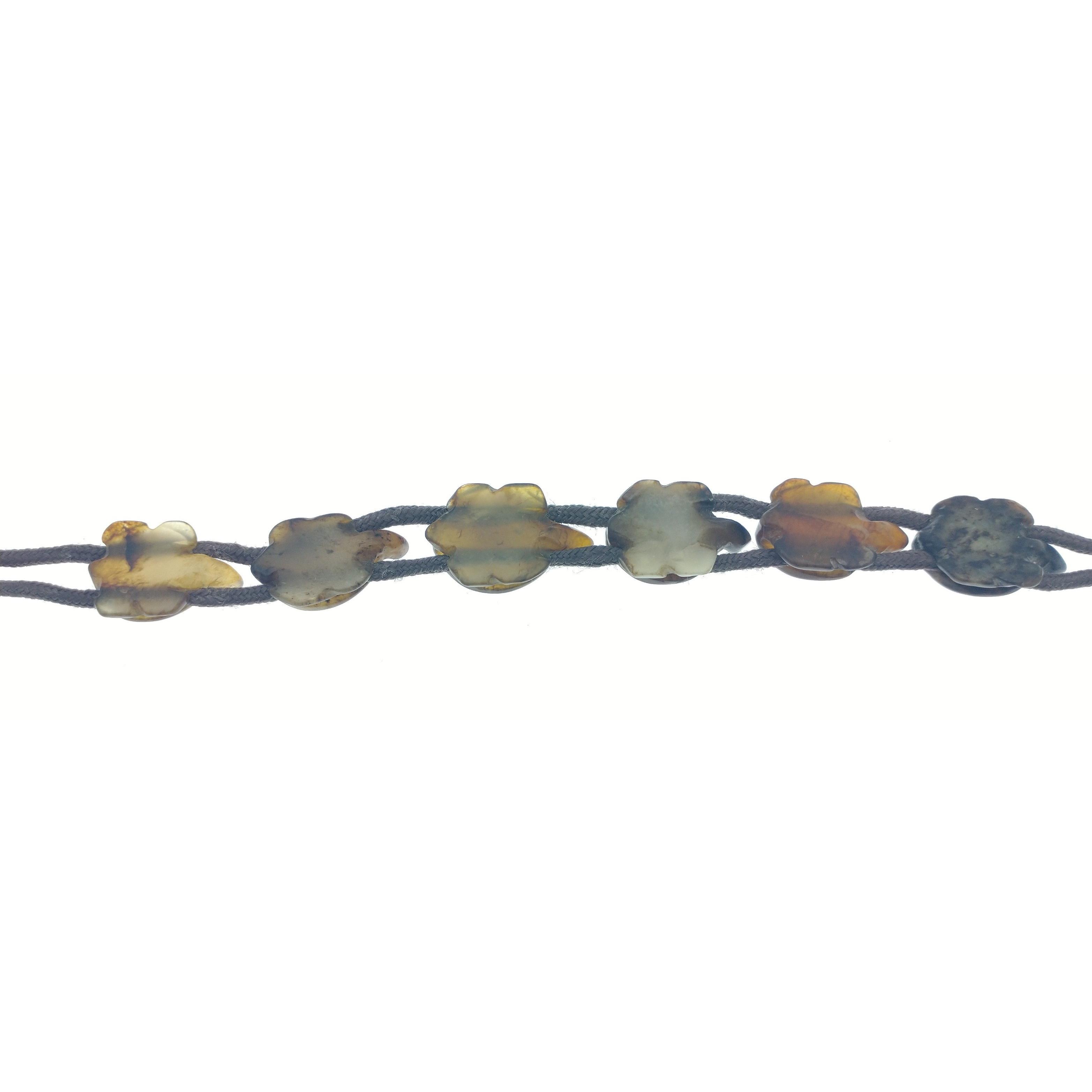 A late 19th century modern strung AMBER BRACELET which consists of six lucky turtles beautifully detailed and in excellent condition. A very rare and unusual item. 28.6g total gross weight approx. Each turtle is approx 2cm and the total piece measures 25cm approx.