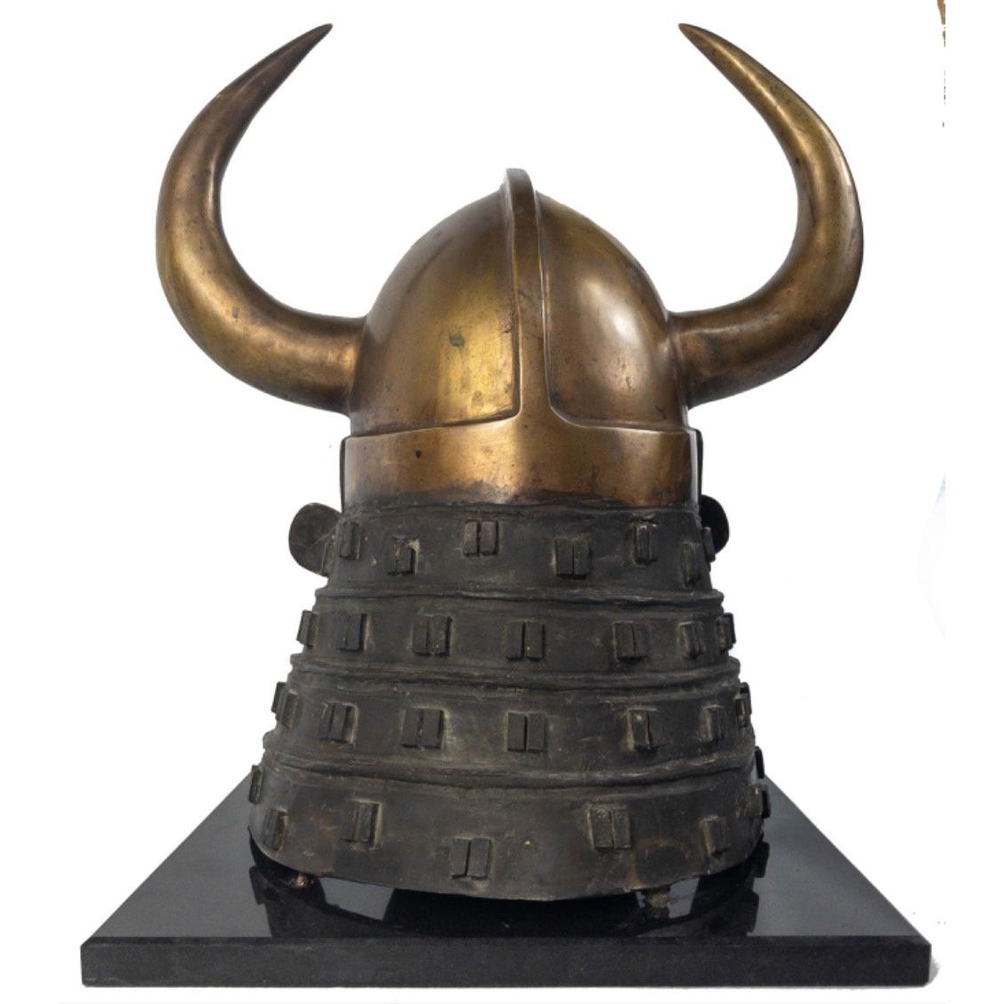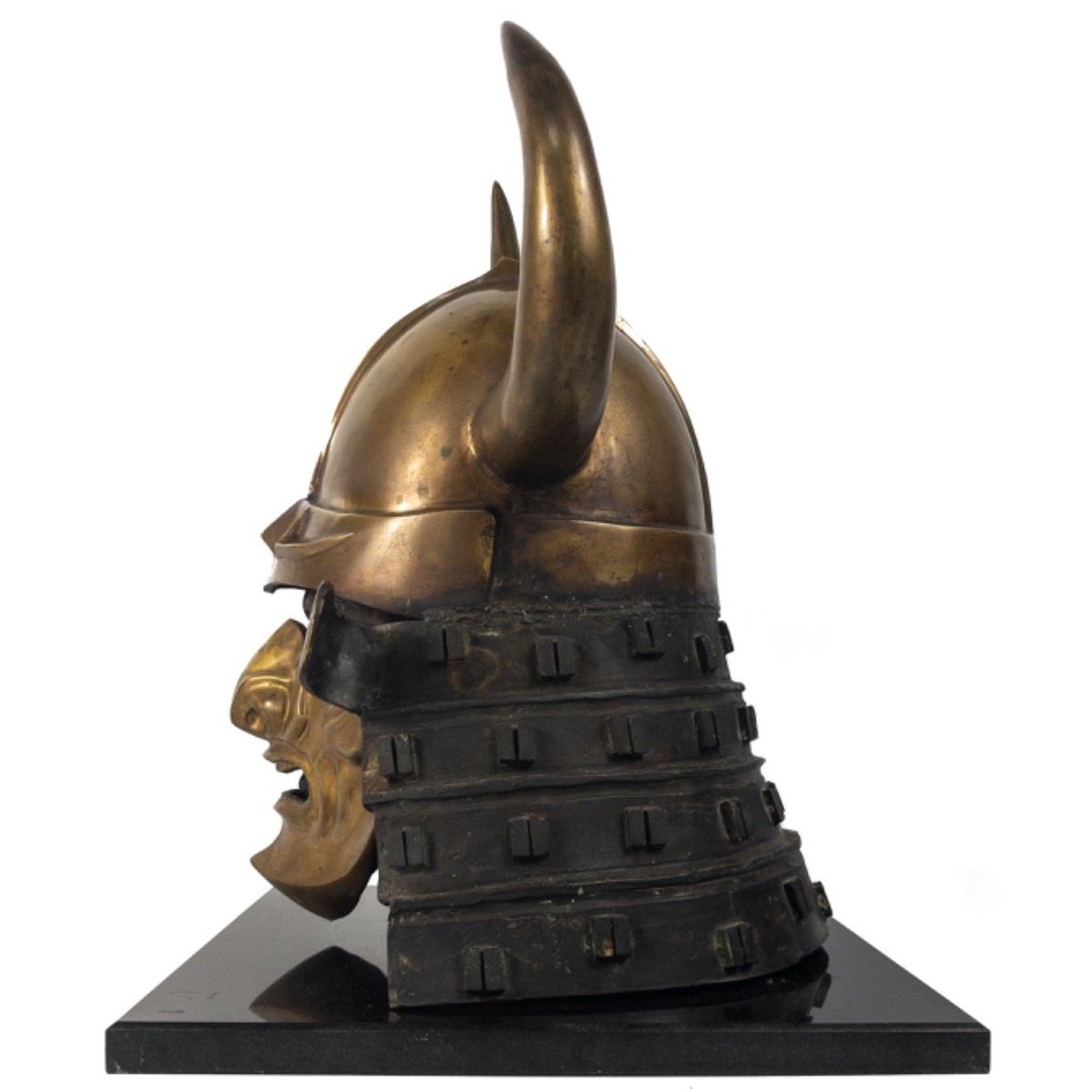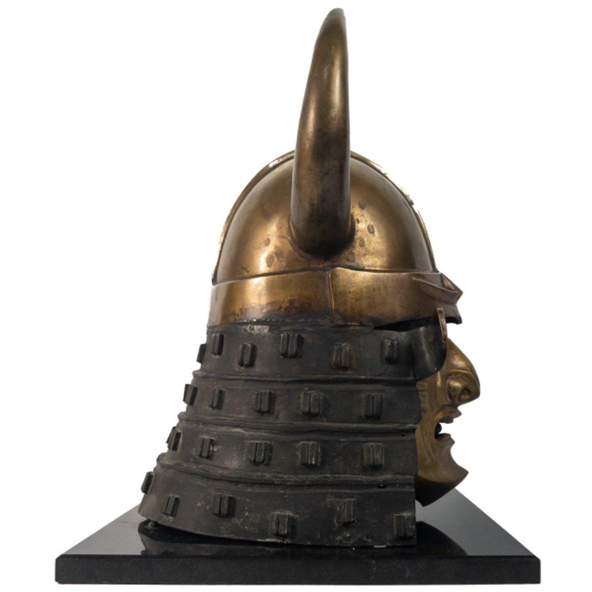 An amazing large Japanese SAMURAI / DAIMYO Commander rank hollow cast horned KABUTO helmet MEMPO (mask) sculpture bust on marble style plinth. Designed to intimidate enemies the helmet was an inportant element of armour worn by the Samurai class in feudal Japan. The KABUTO had laced, laquered scales or KOZANE designed to protect the nape of the neck, the KOZANZE originaly made of leather and later replaced by steel. A substantial and amazing piece.