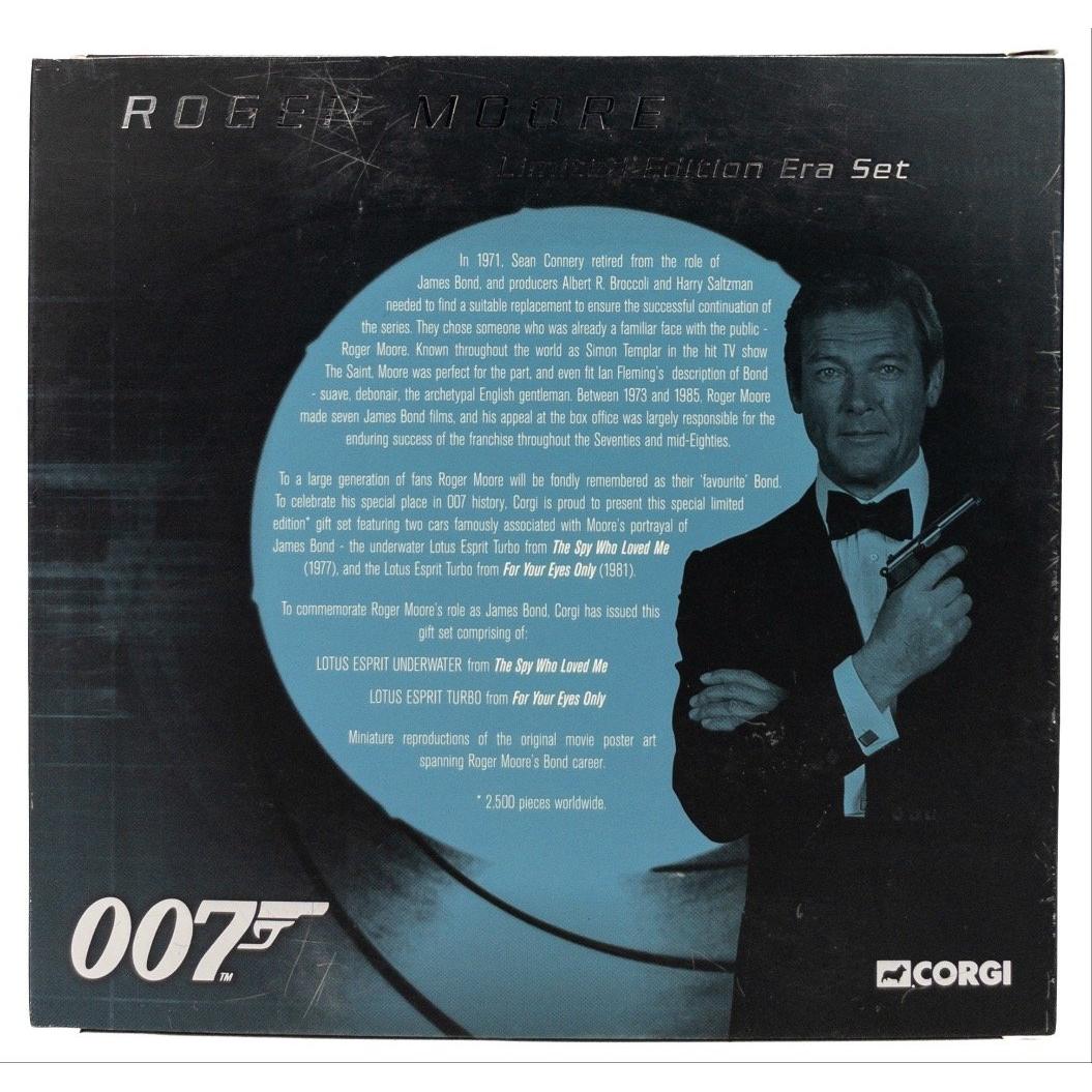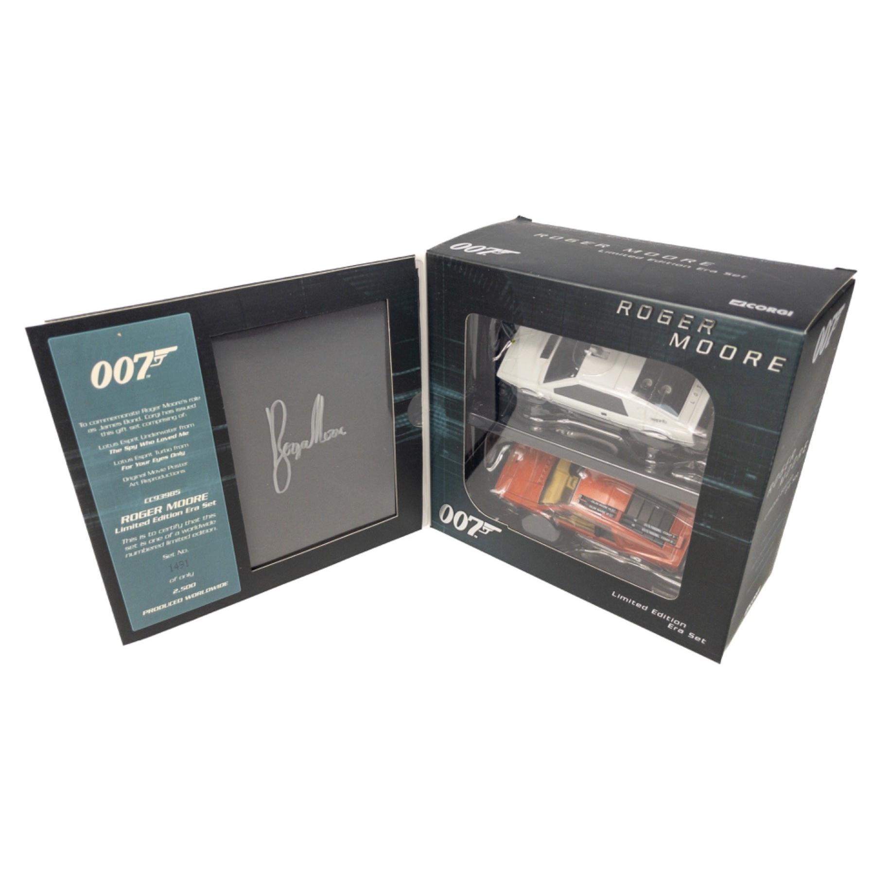 Personally Autographed 007 ROGER MOORE Limited Edition Era Set No 1491 of 2500 (model CC93985) produced WORLDWIDE Ltd Edition by Corgi - to commemorate Roger Moore role as James Bond - featuring the White Lotus Espirit UNDERWATER from The Spy Who Loved Me and also the Lotus Espirit Turbo from For Your Eyes Only