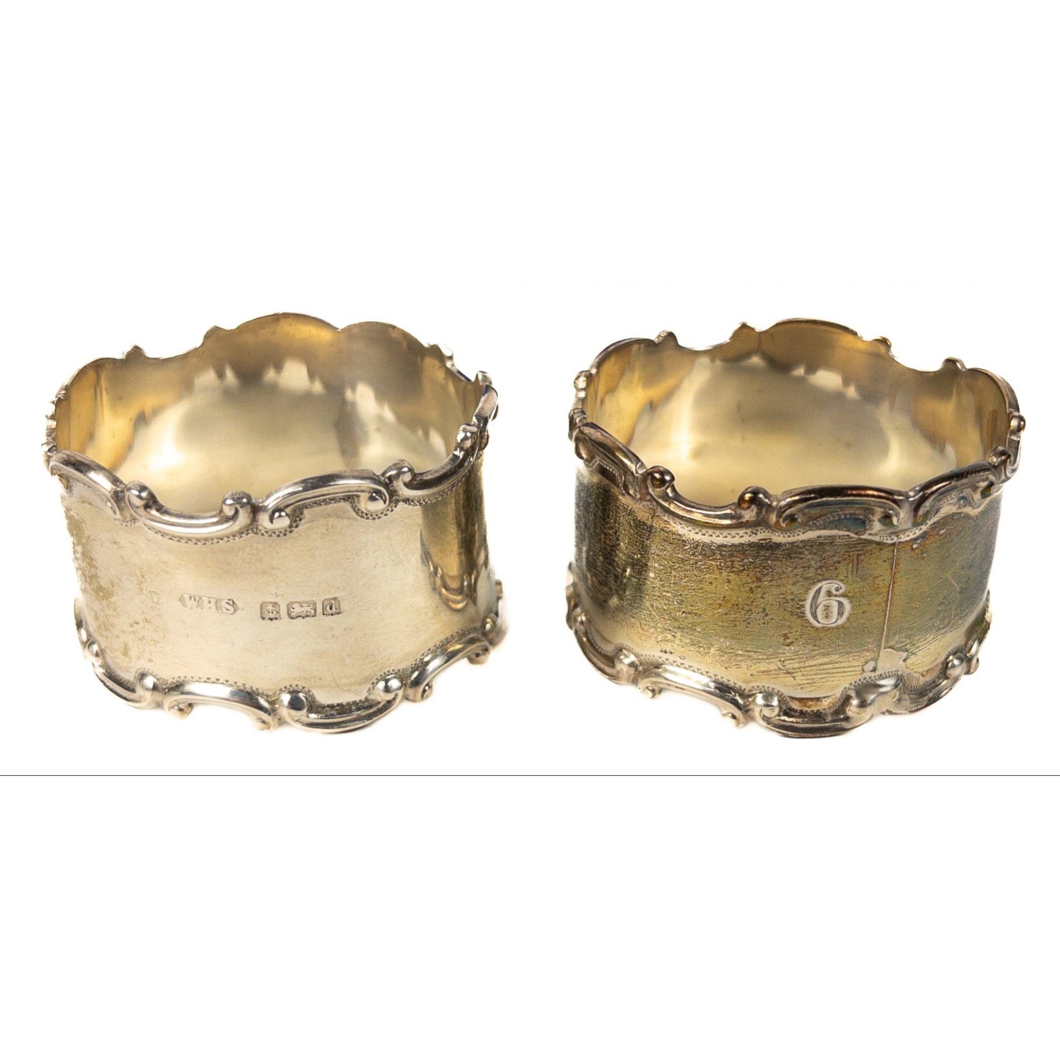 Sterling Silver napkin rings in clamshell presentation case. Numbered 1-6 with hallmarks for Birmingham 1903 maker W.H.S. William Sparrow. Overall rubbing to marks but in nice uncleaned condition. Catch on case is not working.