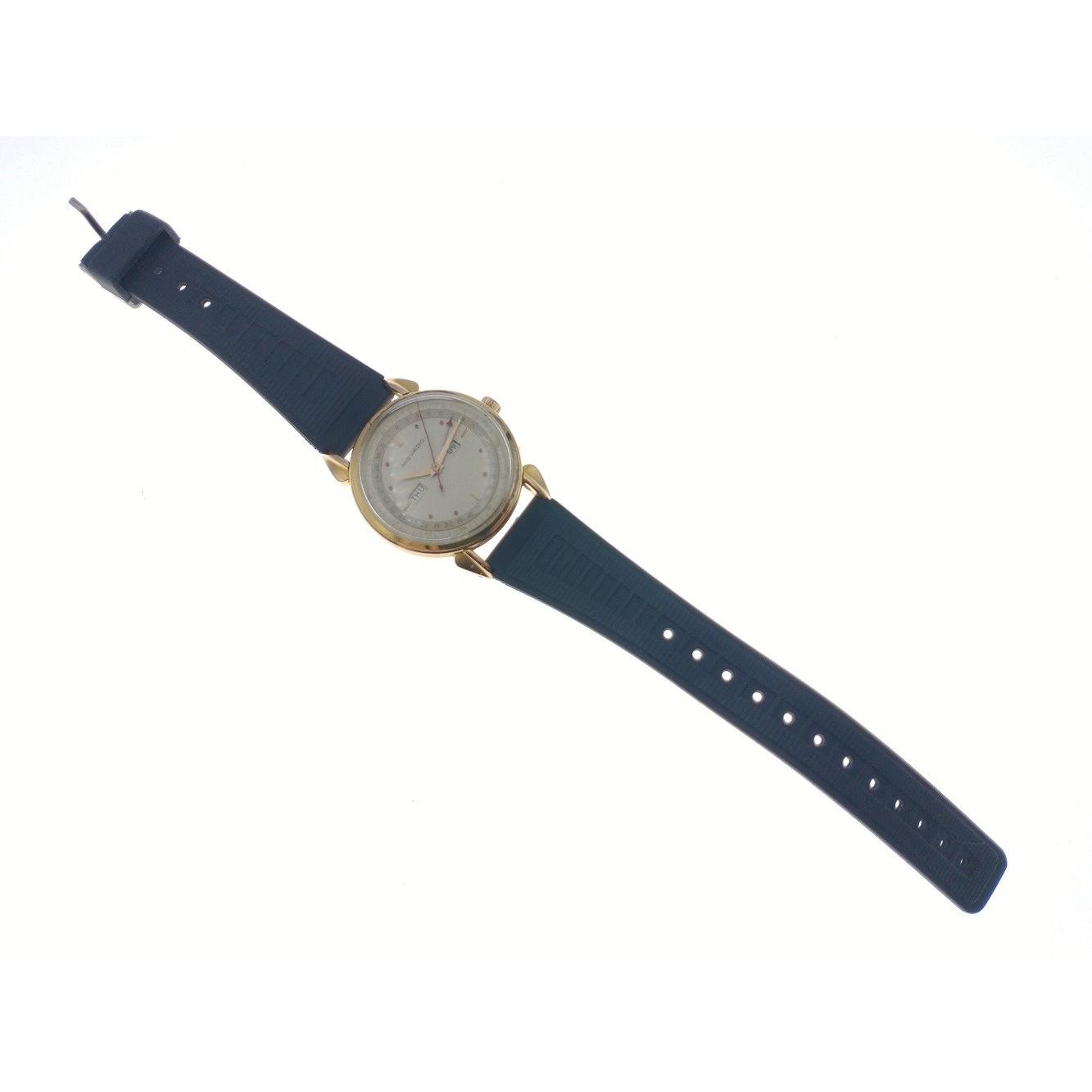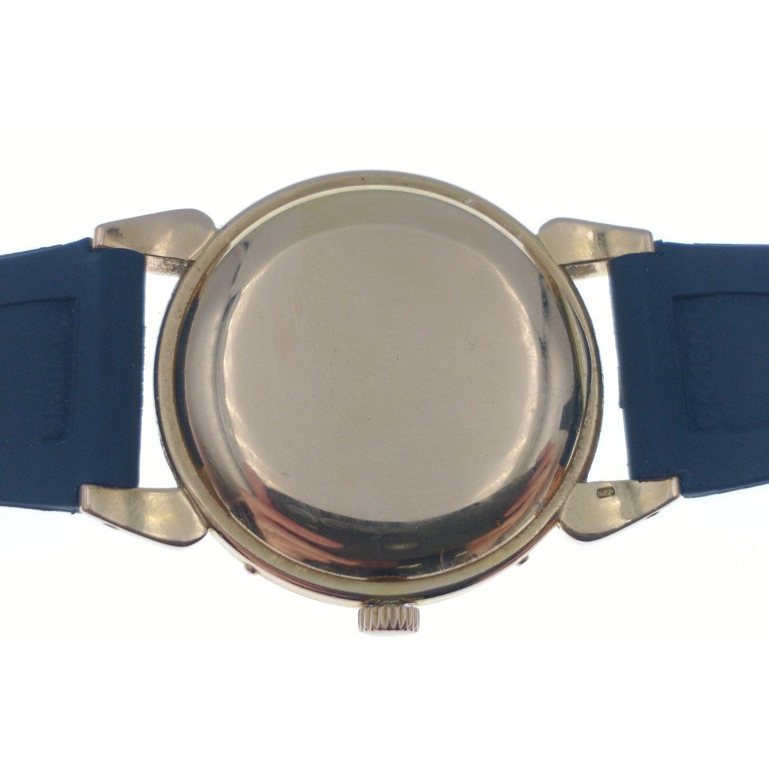 A MOVADO branded 750 stamped YELLOW GOLD cased wristwatch in working order with day and date adjust and black leather strap, gross weight including the light-weight strap 45.30g approx - this watch comes with no paperwork or box and was a gift presented to the vendor - cost new £2500!