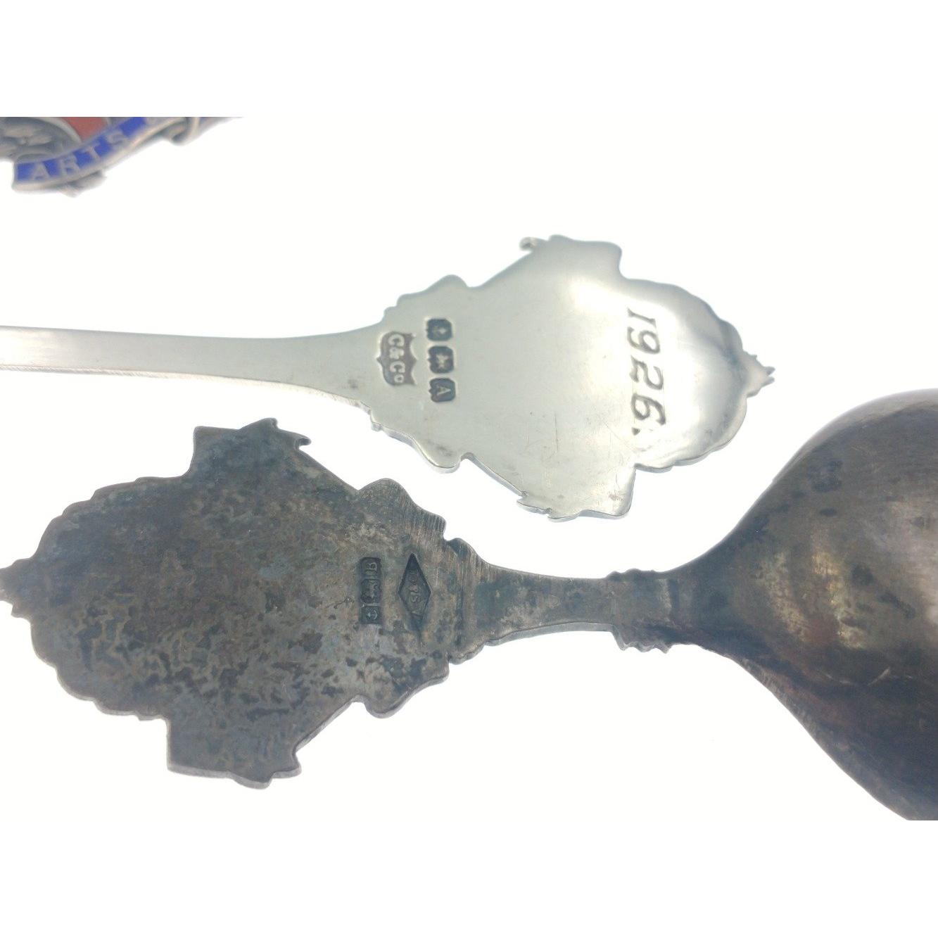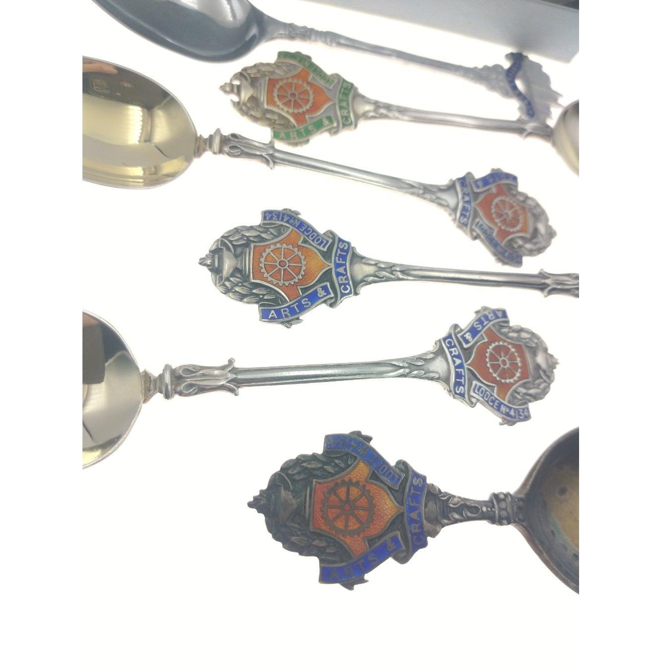 RARE! - Arts and Crafts inspired MASONIC tea caddy spoon with Arts and Crafts and LODGE No 4134 inscribed on the blue enamelled handle, with the Masonic Round Table depicted in red enamel - Birmingham Hallmark by Silversmiths AS and Co - dimensions 8.5cm length and gross weight 22.36g approx, with also an Arts and Crafts Lodge 4134 souvenir teaspoon still in its box with four other enamel spoons out of boxes with also a white metal BUCKFAST ABBEY tea caddy spoon for the tourist market dimension 11.5cm length
