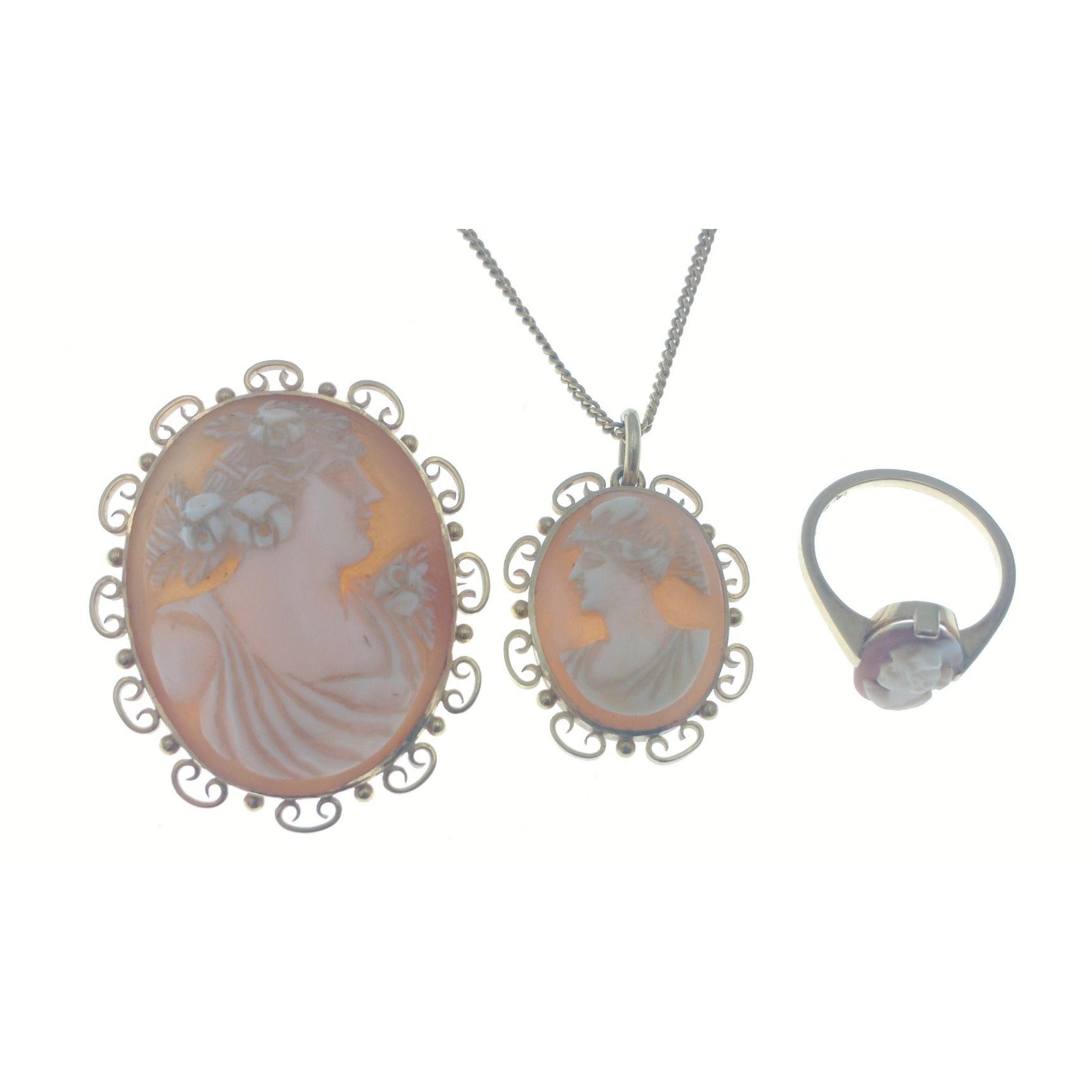 A cameo set in 18ct stamped gold comprising 1 pendant chain 38cm long, pendant 2.5x2.0cm, 1 brooch of a classical lady (4x3cm), 1cameo ring size I/J, total gross weight 18.35gApprox 3 pieces
