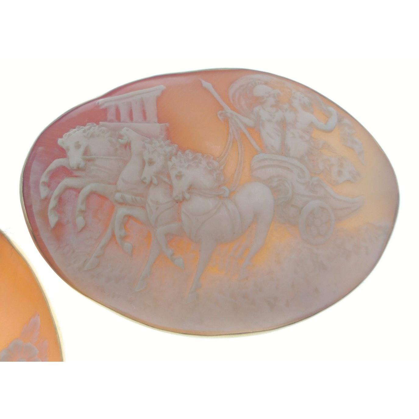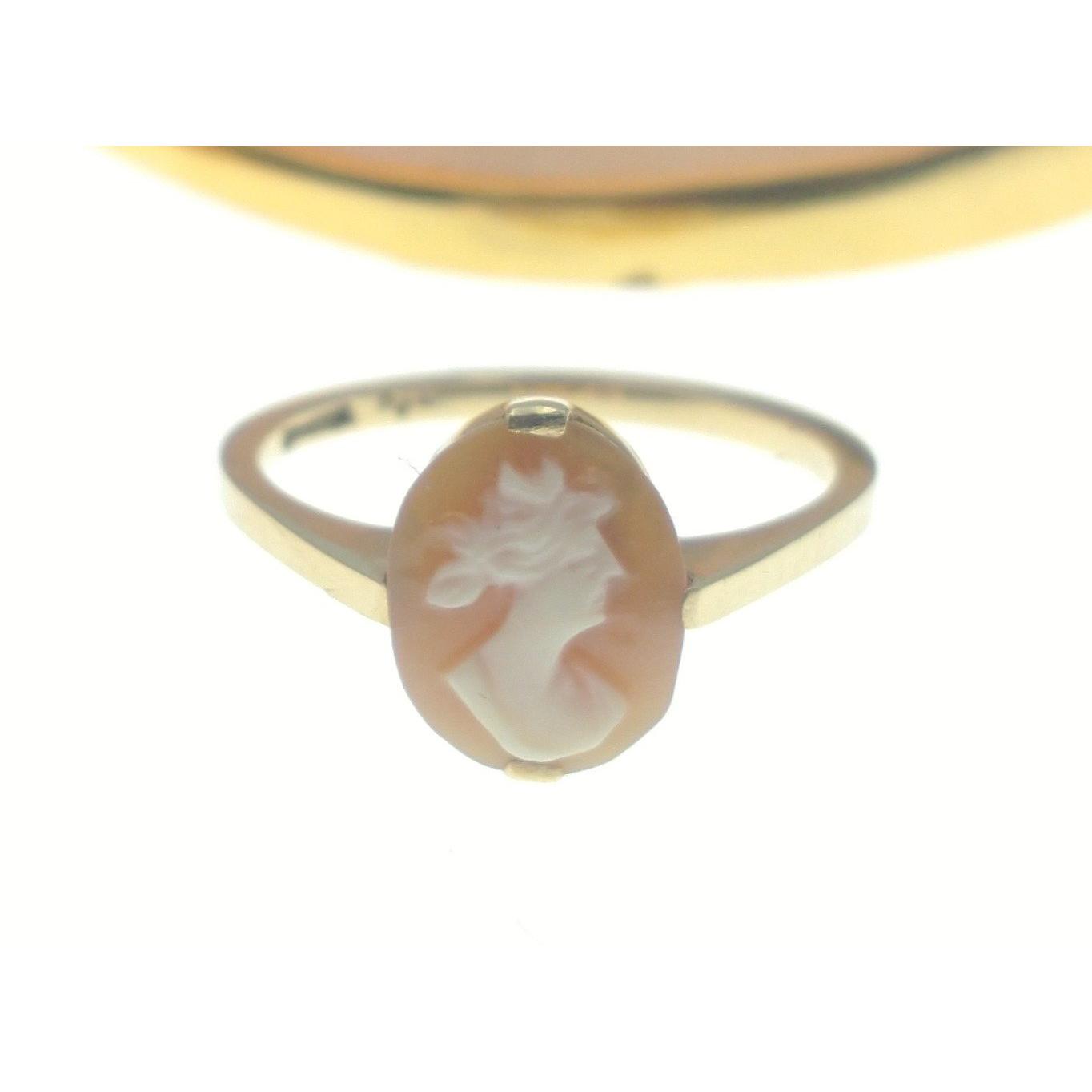 A cameo lady pendant in 18ct gold (5x4cm), with a 15ct 70cm chain, a cameo brooch of horse and carriage 5.5x4.25cm, a cameo gold ring Size I/J, total gross weight 43g plus a semi-precious stone brooch