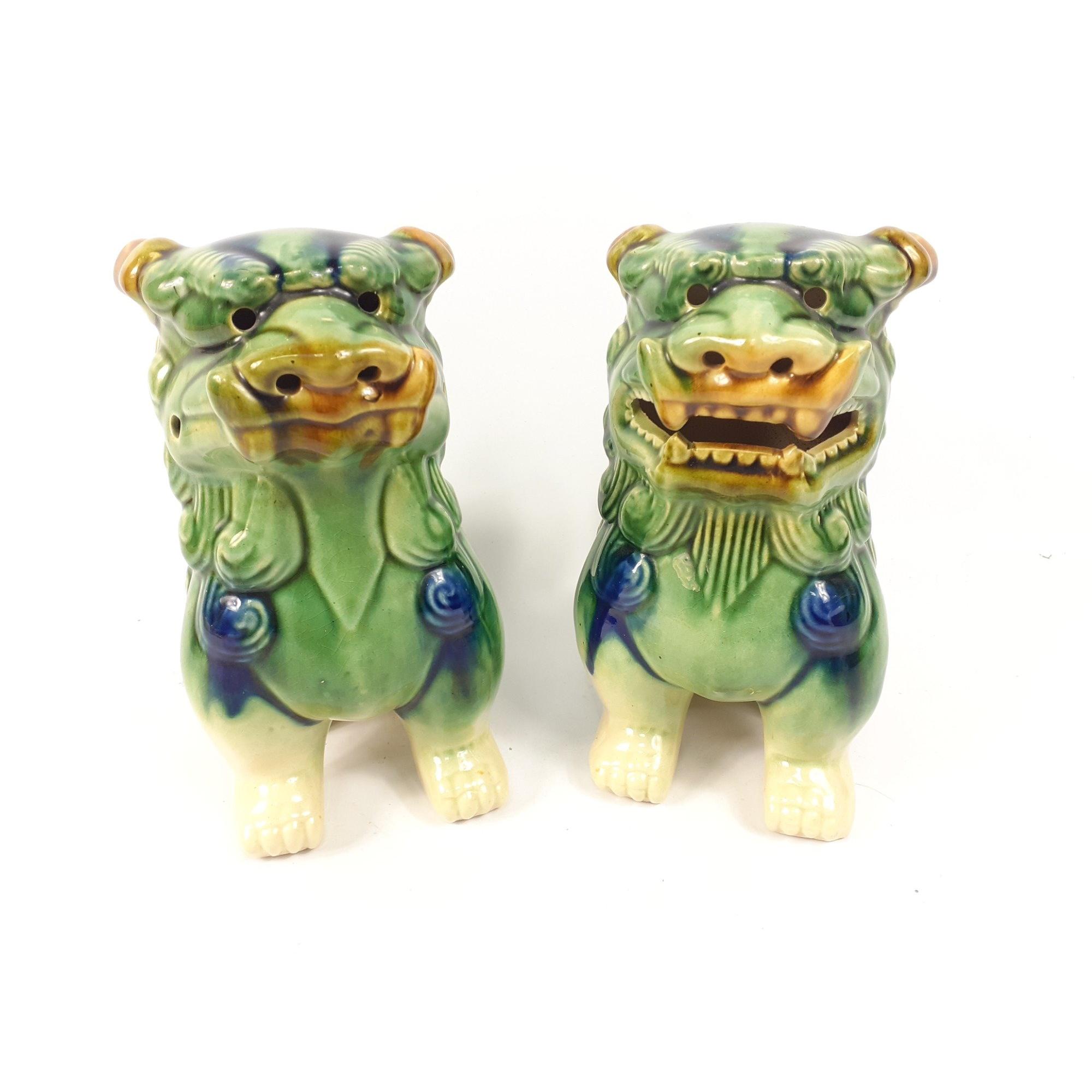 A pair of attractive decorative jade green coloured glazed ceramic FOO DOGS in lovely condition with no chips or repairs. Possibly incense burners as the nostrils and eyes have openings Each stands 22cm high approx. One with mouth closed and one with mouth open. A super little ornamental pair.