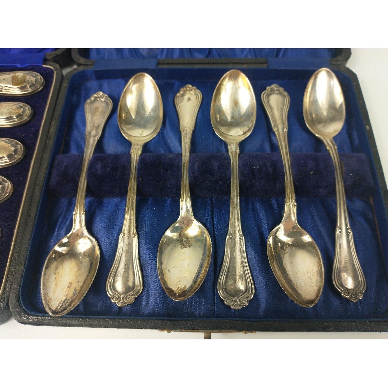 Two cases of silver cutlery to include Birmingham 1919 teaspoons by G.M. &Co (90g approx) and set of Sheffield 1918 silver handled knives (approx 190g)
