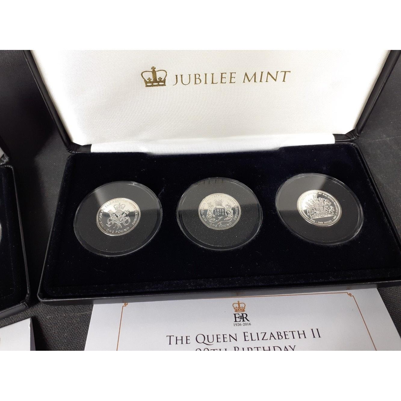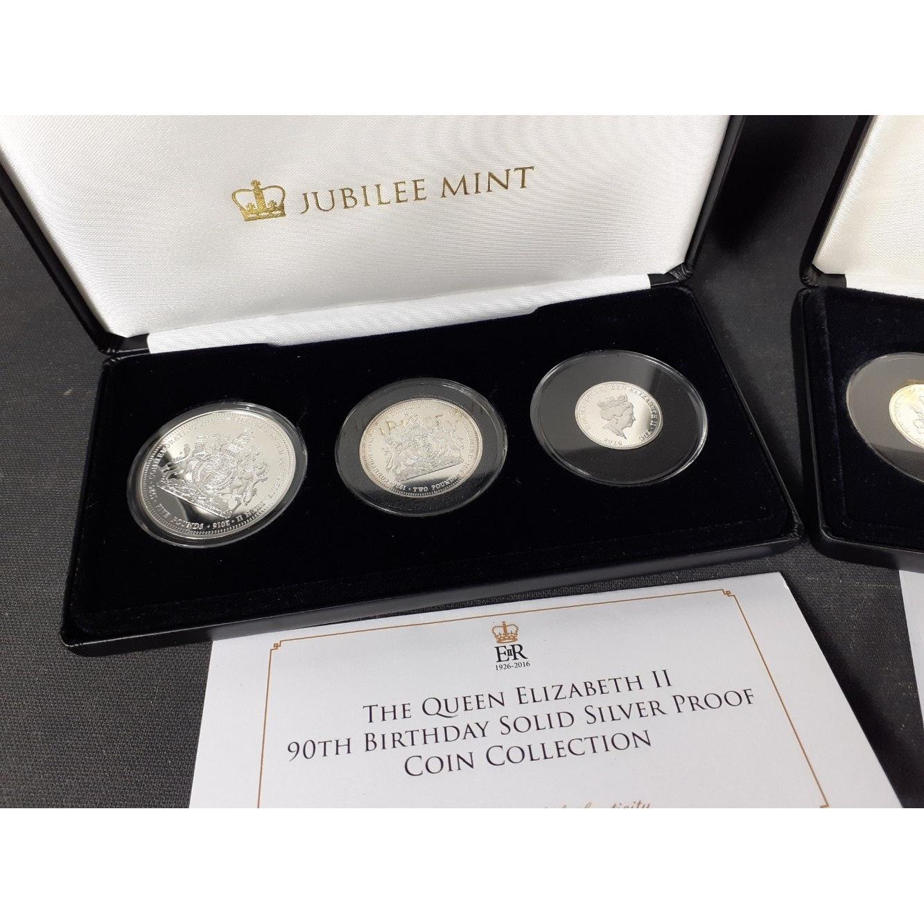 JUBILEE MINT. Queen Elizabeth Sets x2 The Queen Elizabeth II 90th Birthday solid silver proof collection containing encapsulated £5, £2 and £1 coins and The Queen Elizabeth II 90th Birthday solid silver proof £1 3 coin collection. Both in carefully stored condition with certificates and outer sleeves