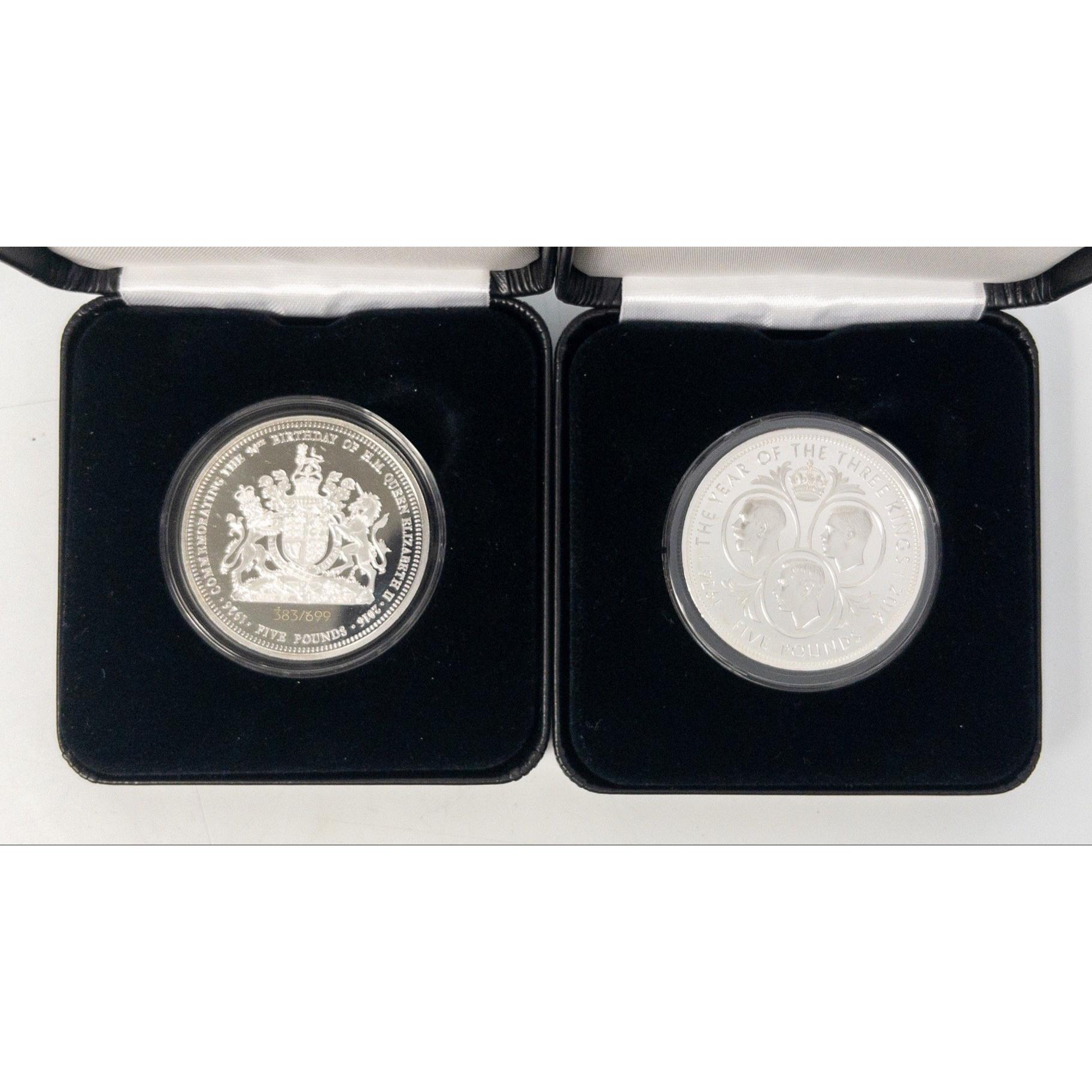JUBILEE MINT. Queen Elizabeth coins x2. 90th Birthday solid silver proof £5 and The Year of the Three Kings 80th anniversary £5. Both well stored and complete with certificates and outer sleeves
