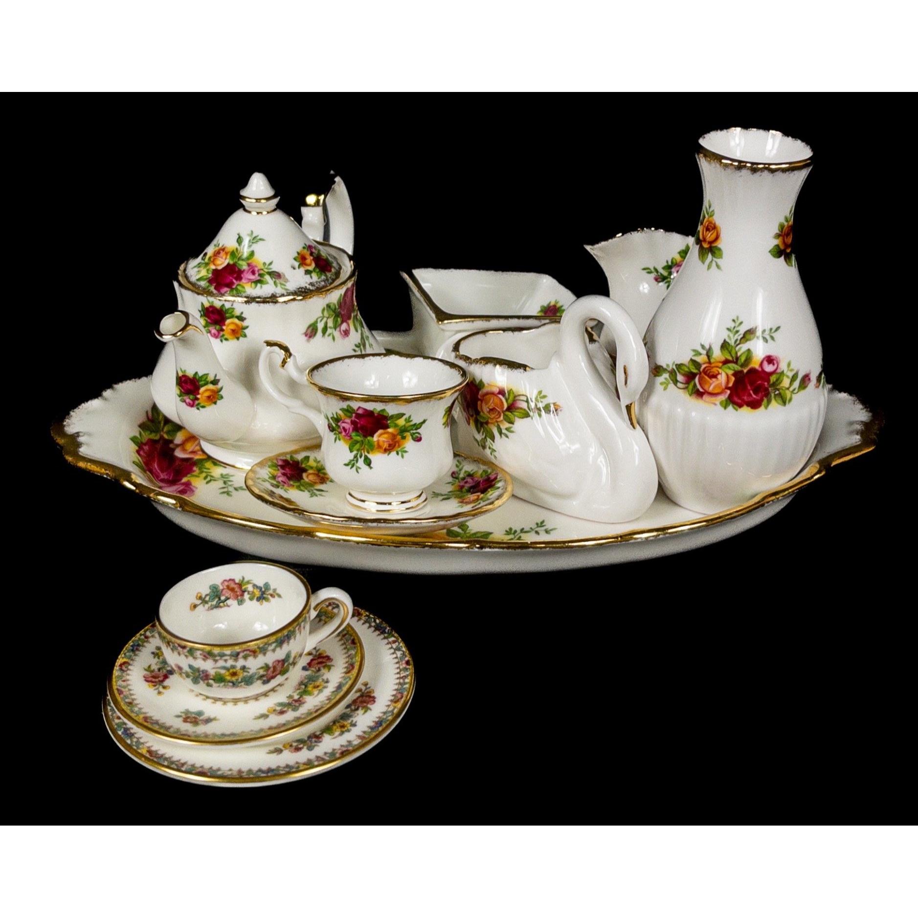 A tiny-sized collection set of FINE BONE CHINA ROYAL ALBERT Old Country Roses to include an oval tea tray 26cm length, with a lidded teapot and other items, 10 items in total. with a small onesy dolls-house set by Coalport to include cup and saucer, and side plate