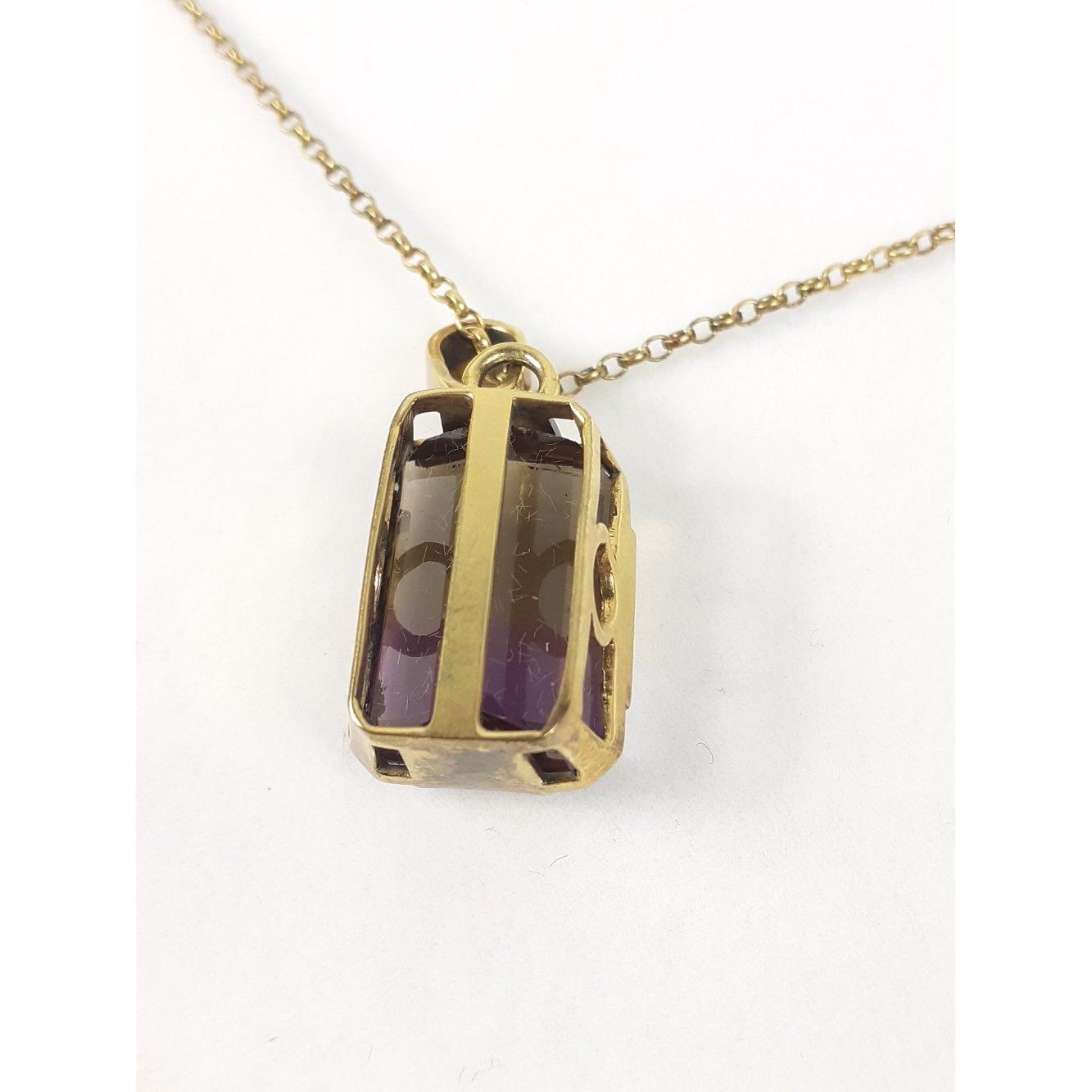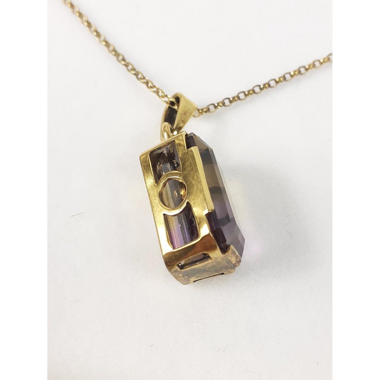 An AMATRINE pendant in gilt setting on a gilt chain made bespoke by ALCHEMIA GALLERY OF Edinburgh, Scotland. The amatrine is beautifully cut in an emerald style showing off the contrast between the purple and smokey citrine quartz colour. The gem measures 20mm x 13mm and has a recessed back. The original purchase price and valuation for insurance price was £350.