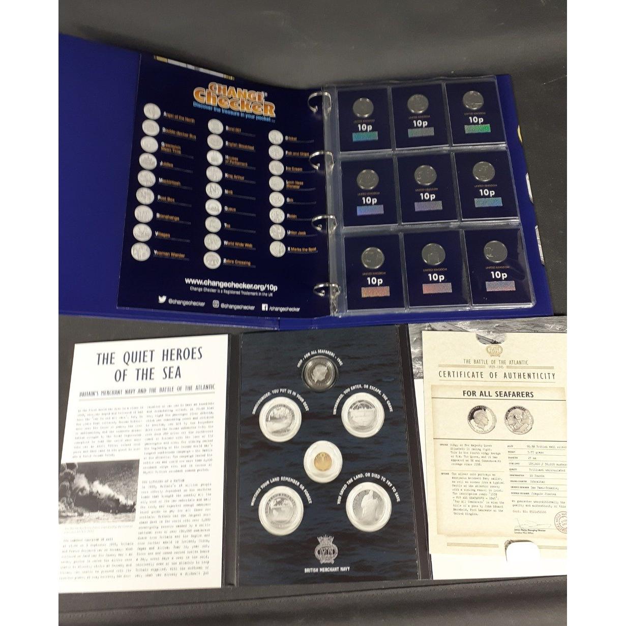 10p Coin Collection. A CHANGE CHECKER folder containing the full set of 10p coins in sleeves and in excellent condition. Also includes London Mint Battle of the Atlantic folder which contains only one .999 fine coin.