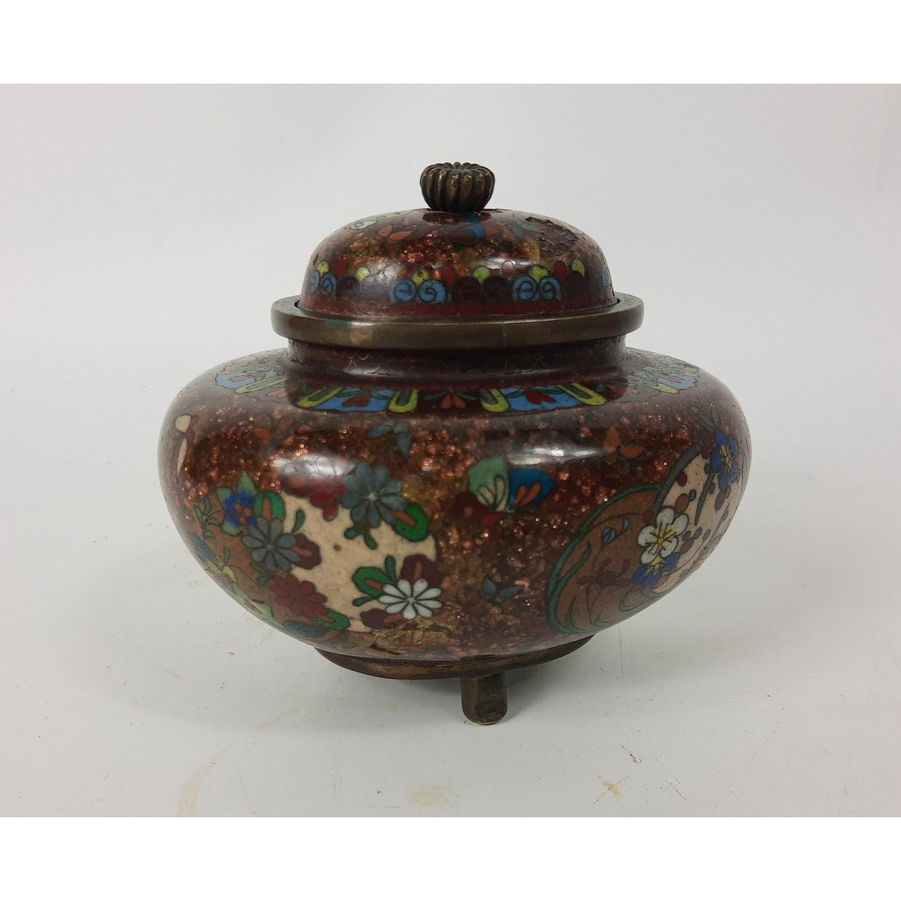 A small cloisonne three footed dish with lid approx 10x 12cm high (3 small chips to sides)Approx 1 pieces