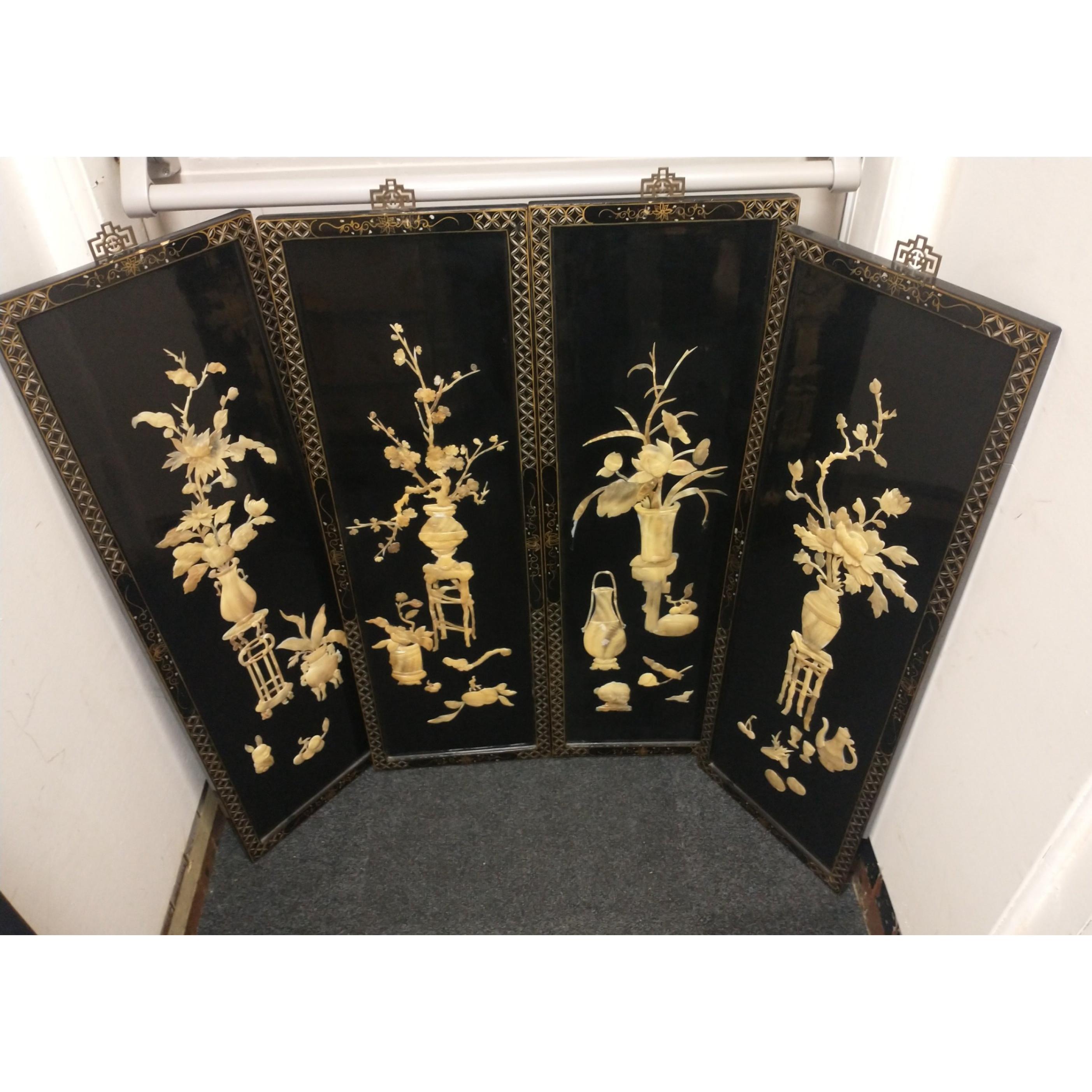 Four large Oriental lacquer and mother of pearl panels with raised floral decoration 92x30cm approx, a few small chips Approx 4 pieces
