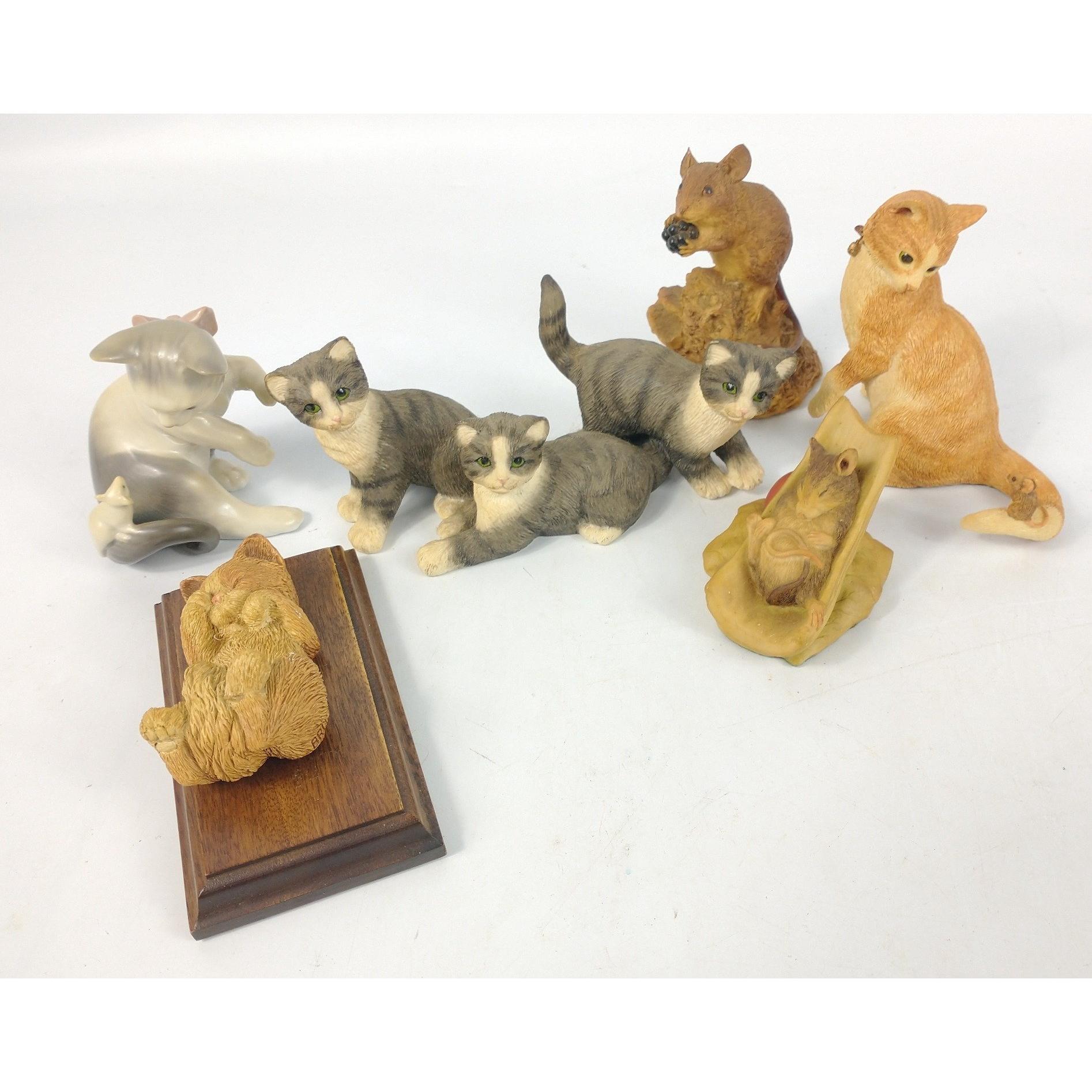 Several groupings of cats and mice to include a LLADRO cat and mouse 1984 (8cm), a HOLLAND STUDIO CRAFT sleeping mouse (5cm long), a LEONARDO COLLECTION set of 3 cats 1995 (approx 15cm long), a SHERRATT and SIMPSON cat with a mouse on his tail (10cm tall), a SANDICAST Yawner S33 cat on a wooden plinth ( plinth 11x7cm), a mouse eating a bramble (10cm tall)