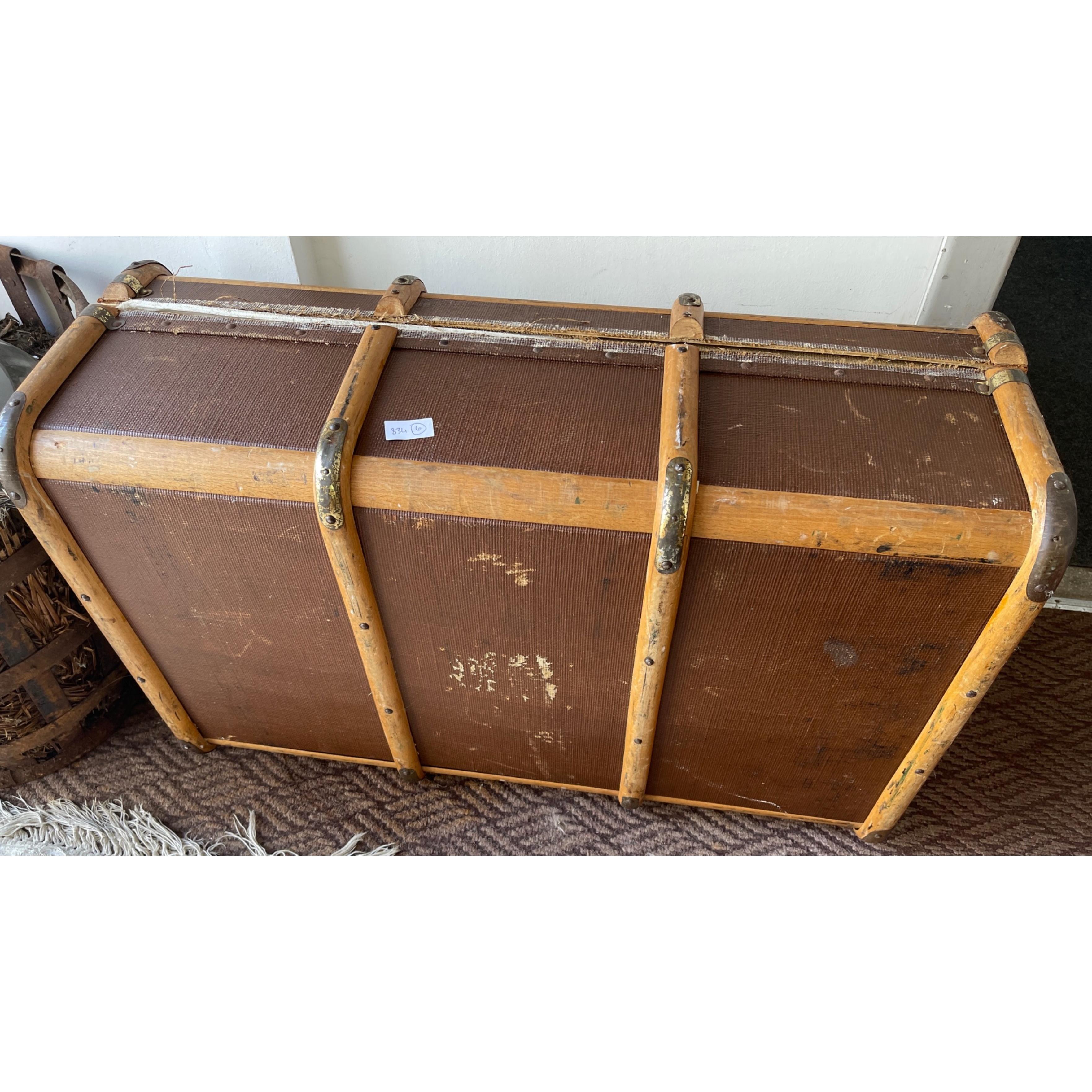 A large VINTAGE steamer travel trunk with bentwood trimmings and two heavy duty leather handles either side - dimensions 50cm depth x 85cm length c 32cm height - would make a trendy coffee table!