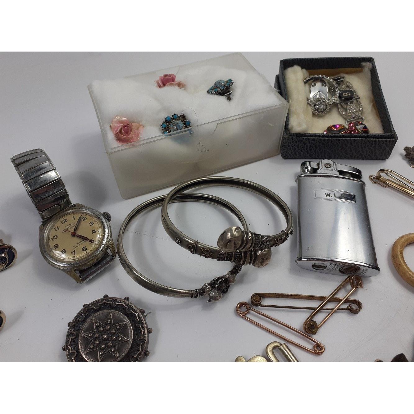 A mixed bag of silver plate and white metal jewellery to include a nurse's buckle, a pair of collar clips, 2 bangles, a marcasite ring (size M), a polished stone bracelet, plus various brooches, rings etc