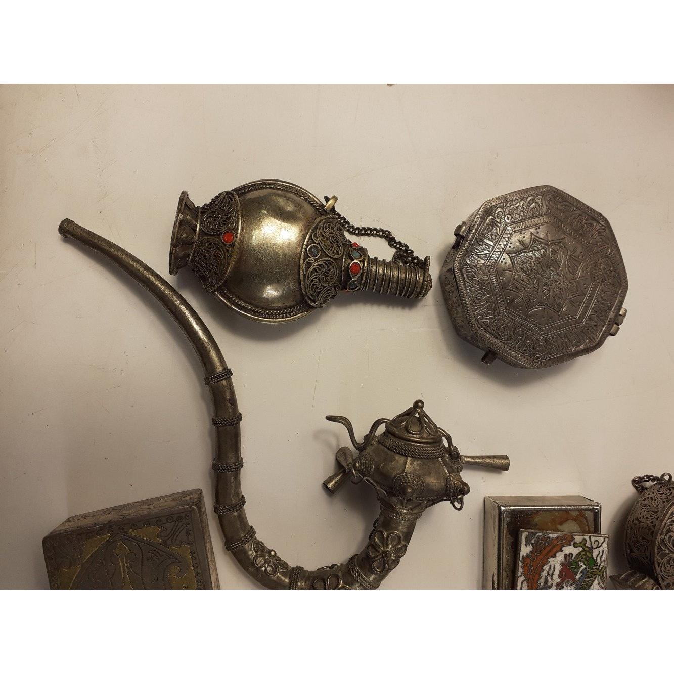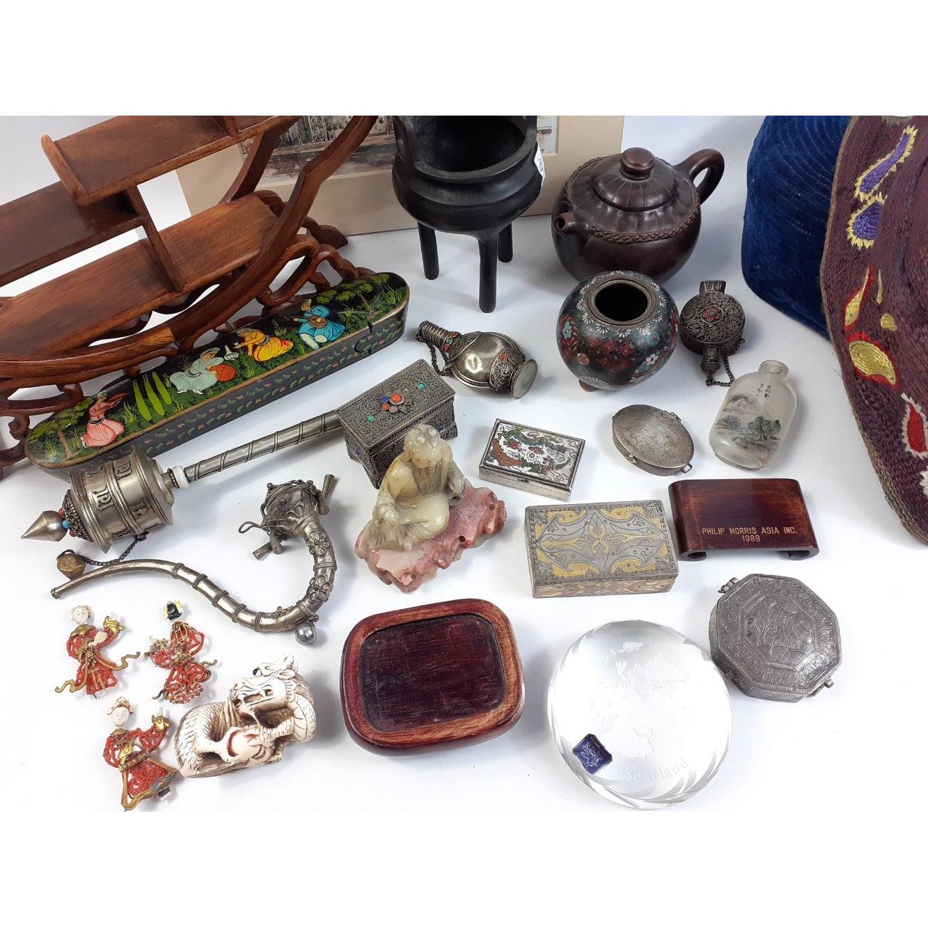 A box containing a small collection of oriental items. To include a collection of small white metal boxes and trinkets, a laquered painted box, a print, various figurines and two woolwork hats.