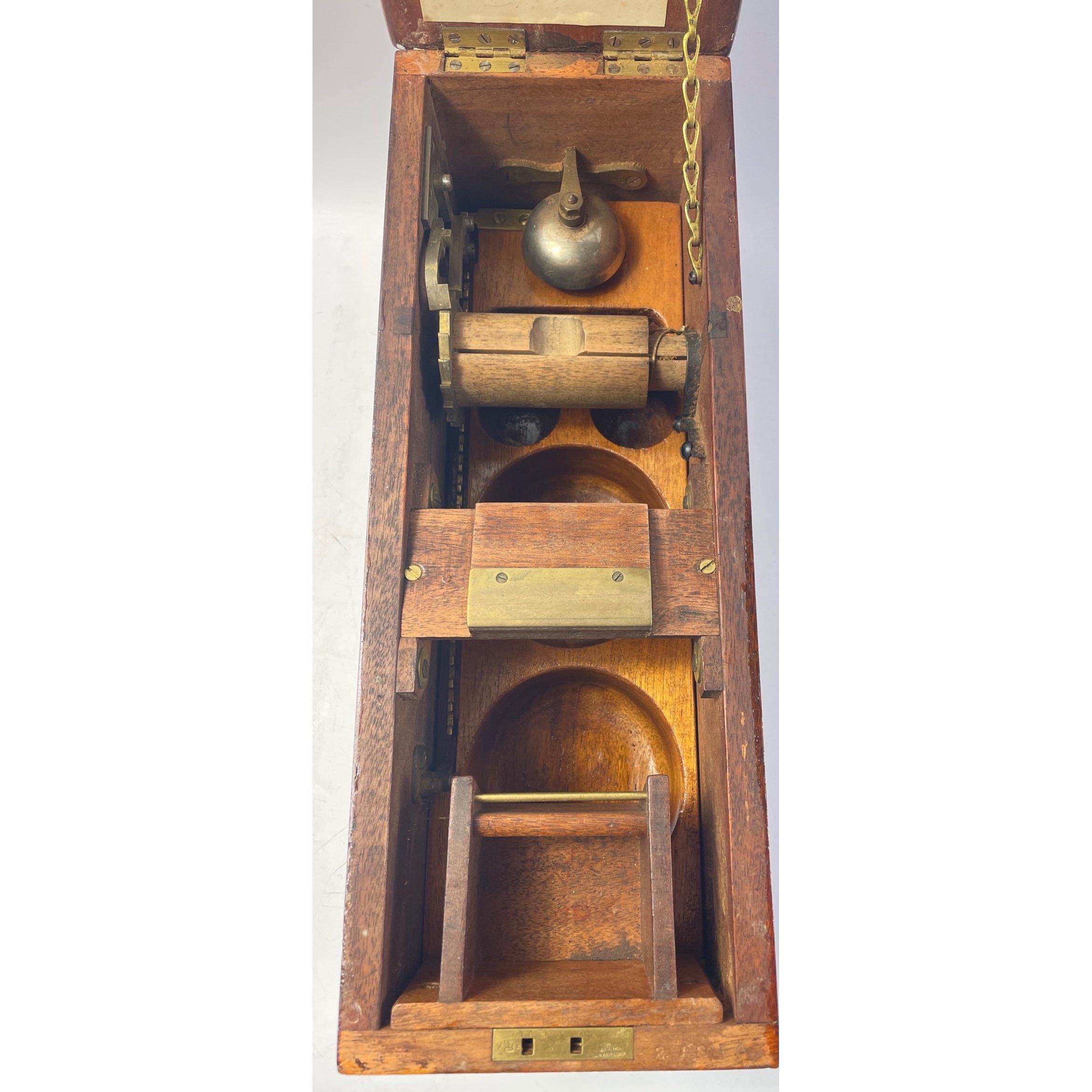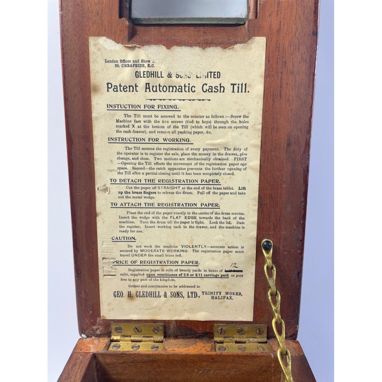 A 19th century GLEDHILL and SONS mahogany patent automatic cash till, no 21814, with a pull out lower shelf with sectional drawer, instructions for using the registration paper are attached to the inner lid, 44x16x18cm