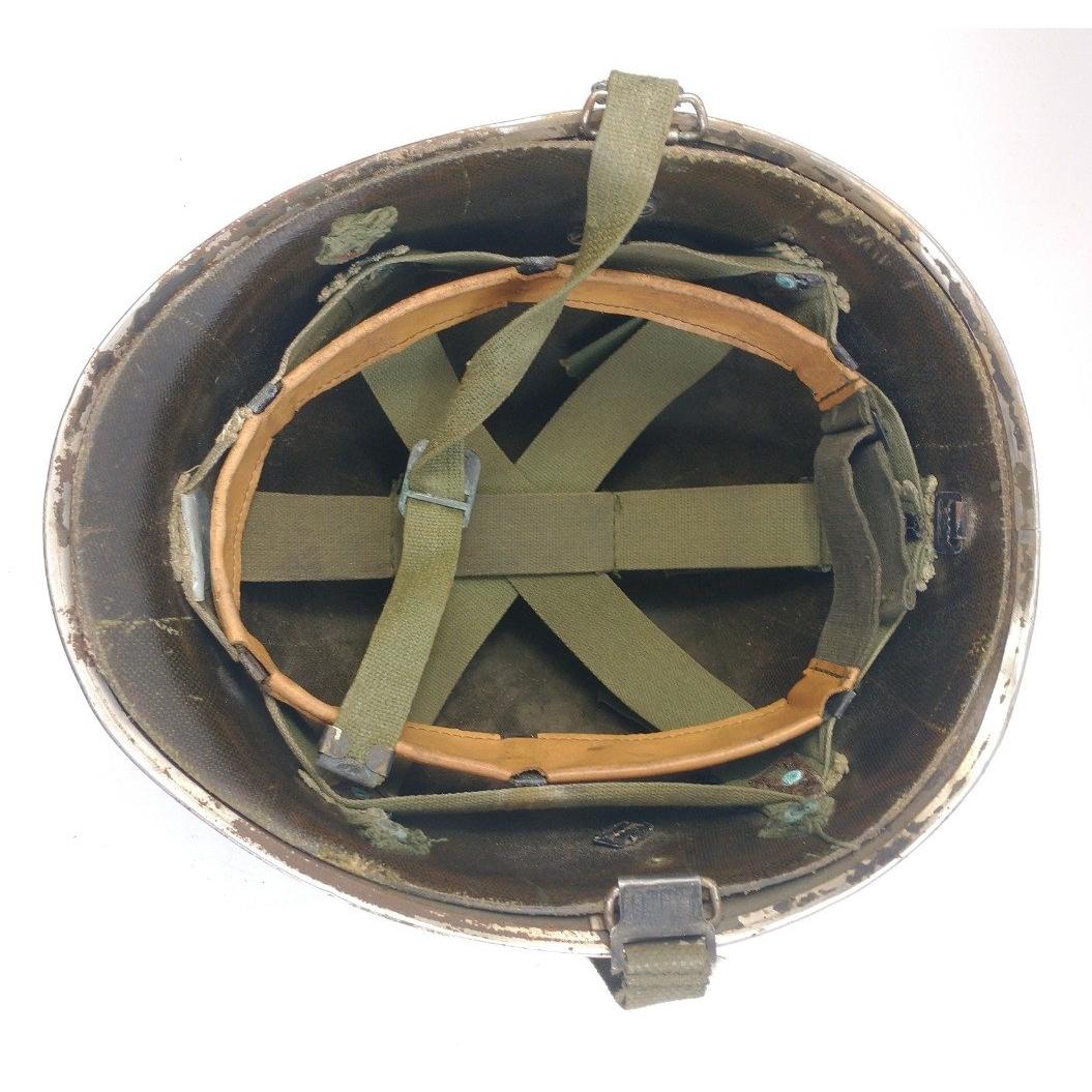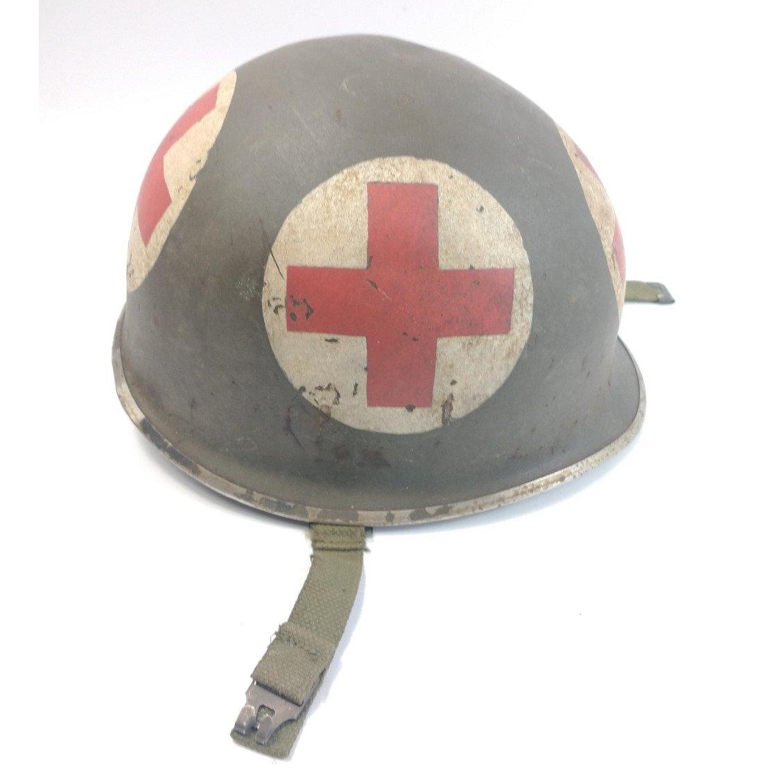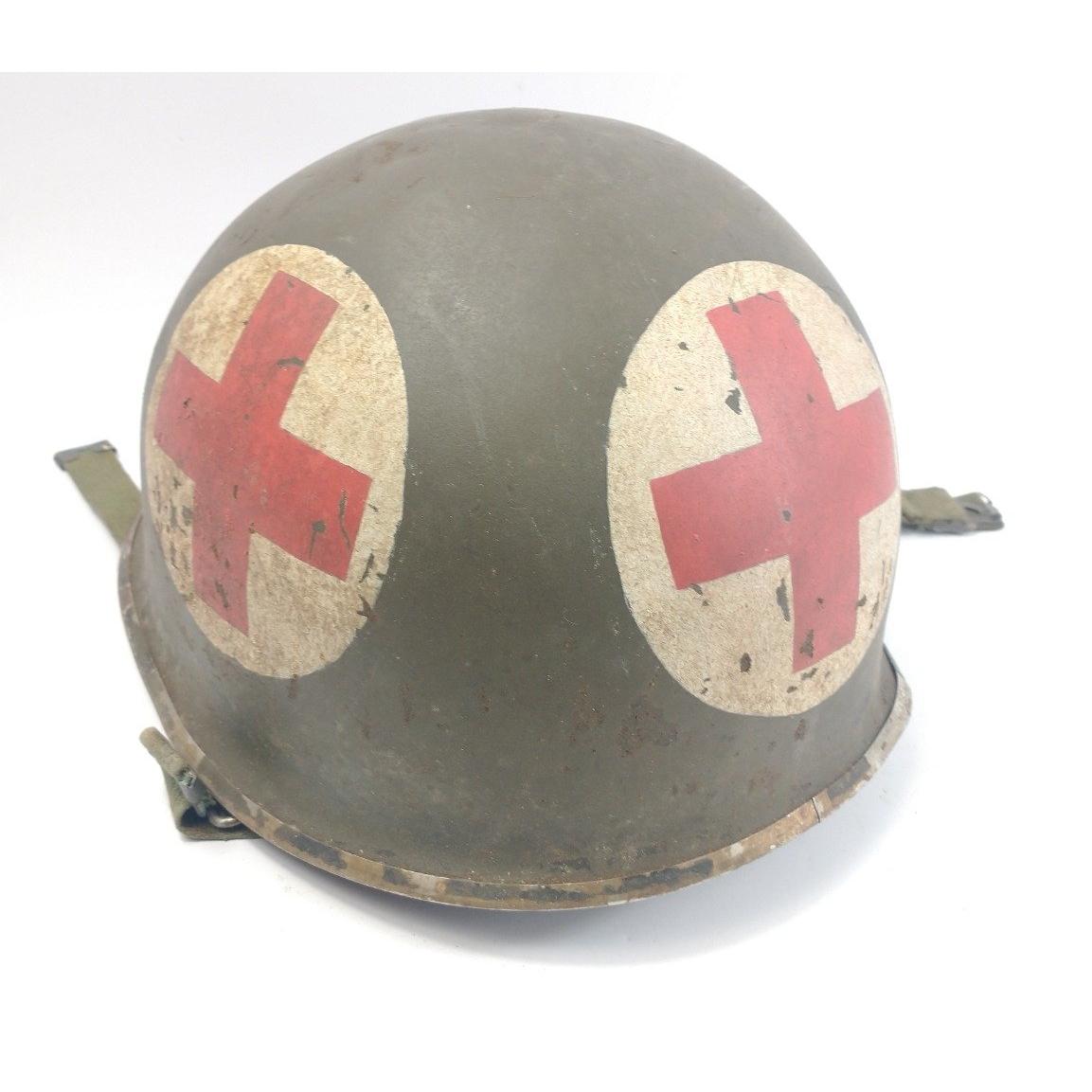 WWII United States US M1 helmet with Red Cross decals. Intact chin strap and liner.