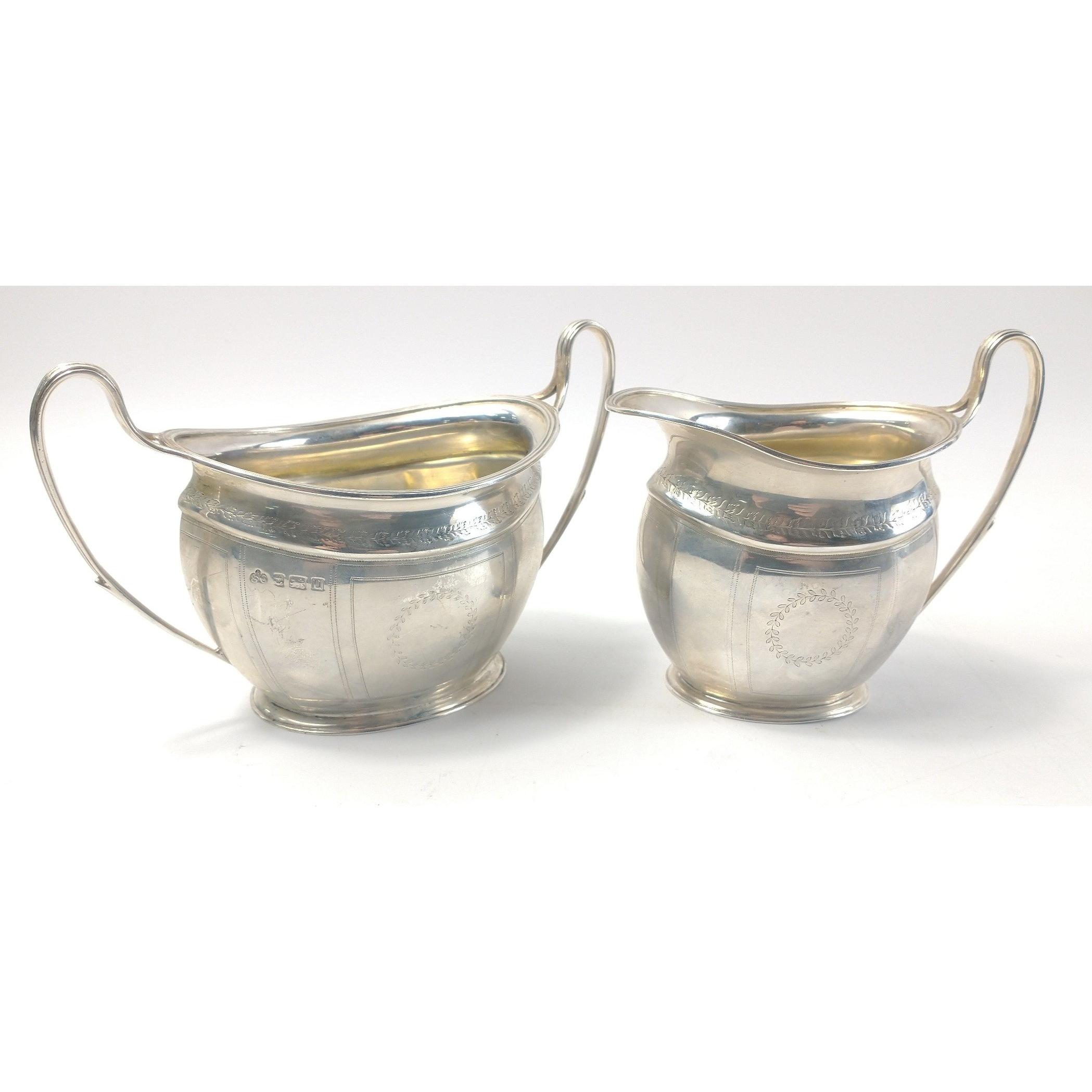 A hallmarked silver, Birmingham 1919, milk jug and sugar bowl by ELKINGTON with laurel wreath decoration, weight 480g approxApprox 2 pieces