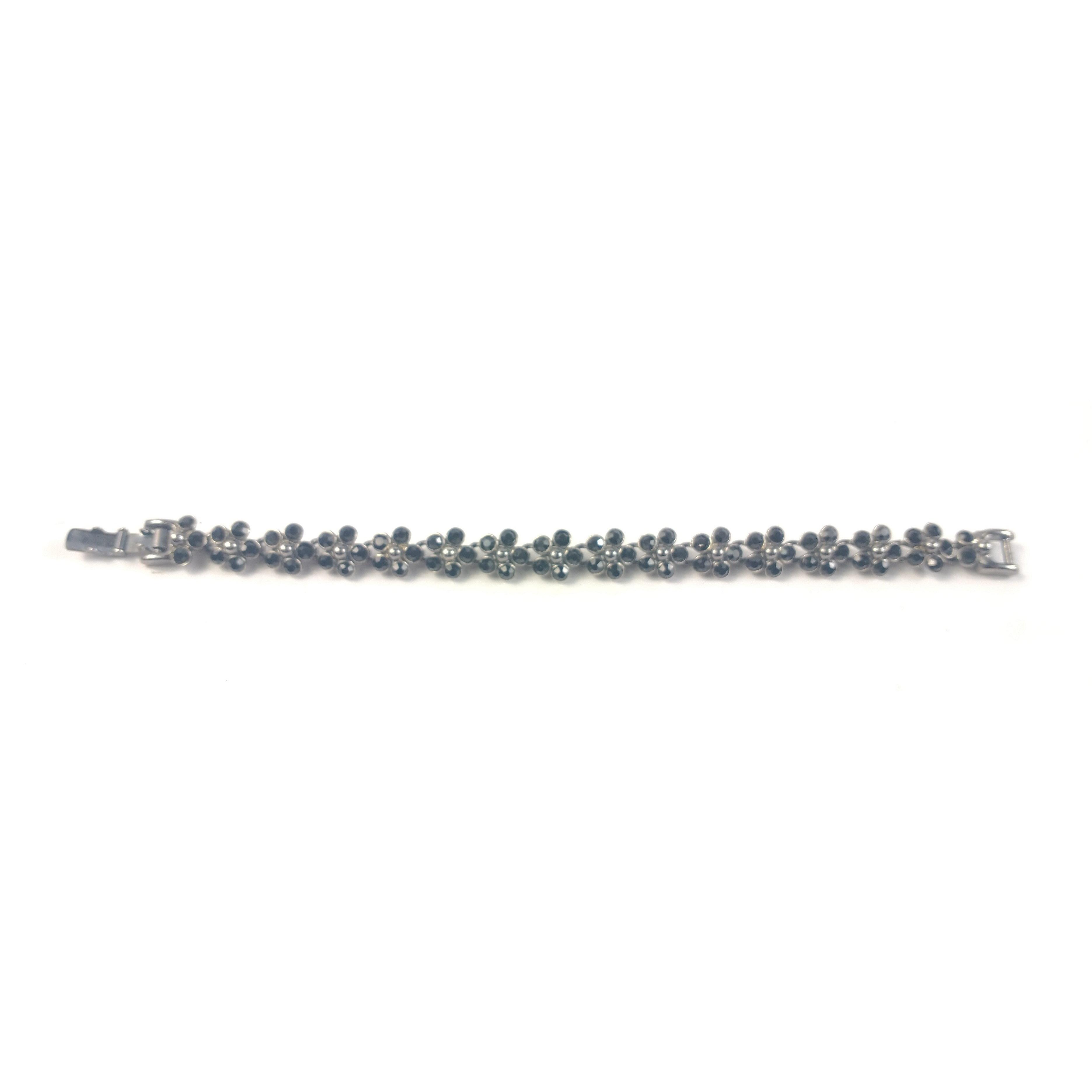 A black-jet floral form white metal bracelet with safety chain, and comes within a nice presentation jeweller's box - would make it an ideal gift for XMAS!