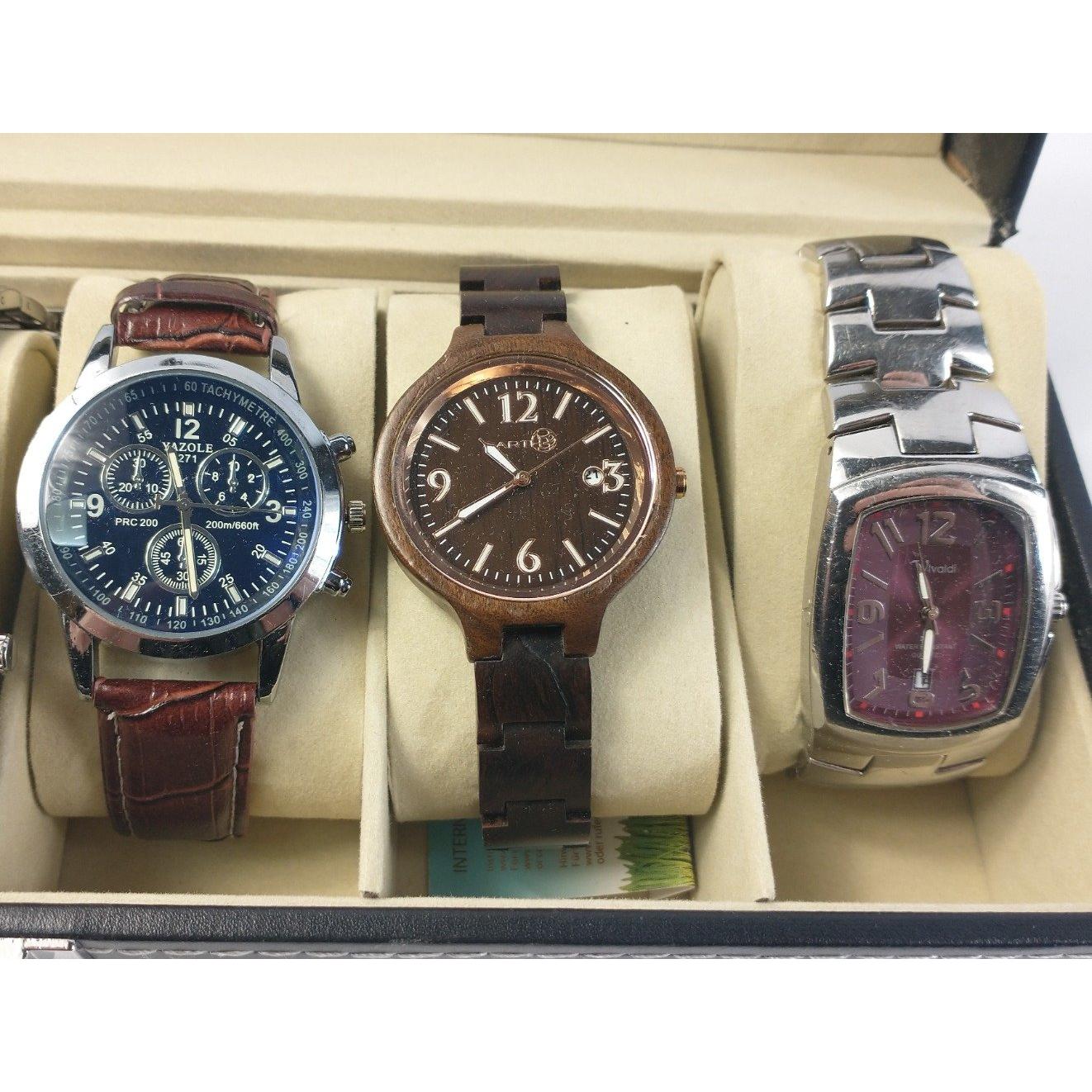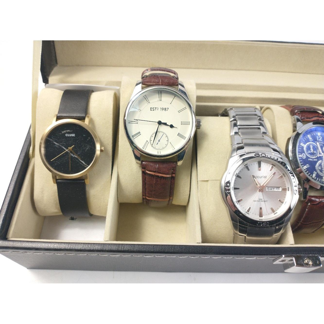 A glass fronted watch display case with a variety of six gents watches Approx 7 pieces