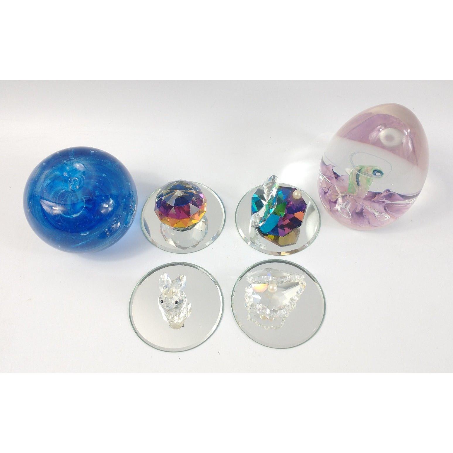 A selection of glass ornaments including two SELKIRK GLASS PAPERWEIGHTS, a SWAROVSKI rabbit, three other unmarked pieces and four small display mirrors Approx 10 pieces