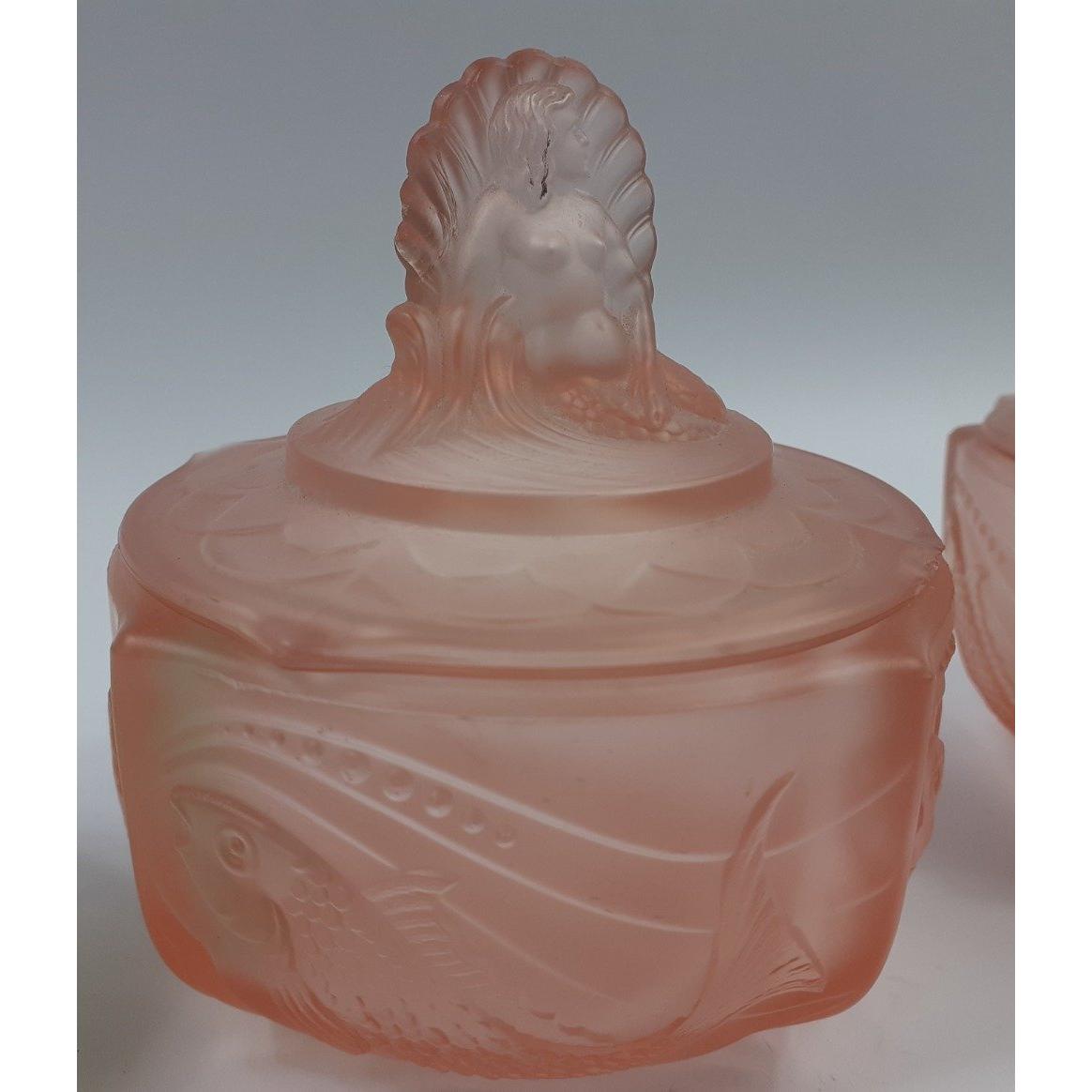 Two pieces of CAITHNESS glass in a green swirl pattern being a perfume atomiser and a small vase (11cm high) and a pair of opaque pink glass trinket boxes (9cm dia) with 2 small chipsApprox 4 pieces