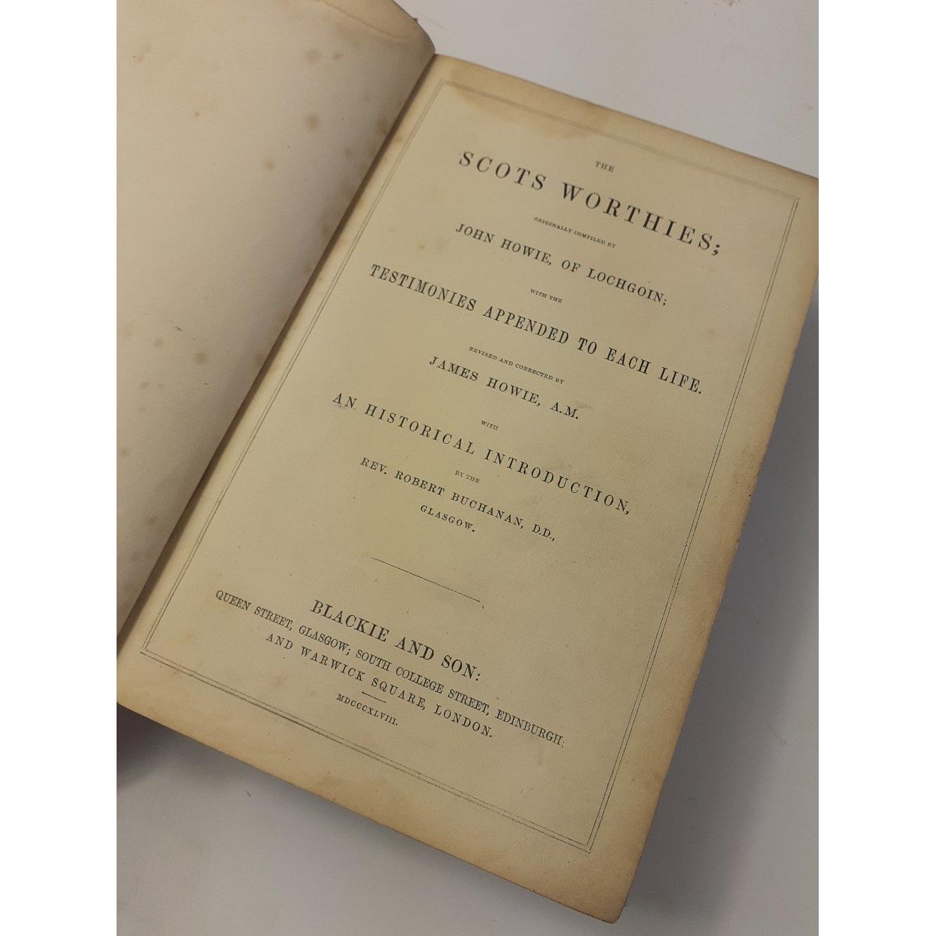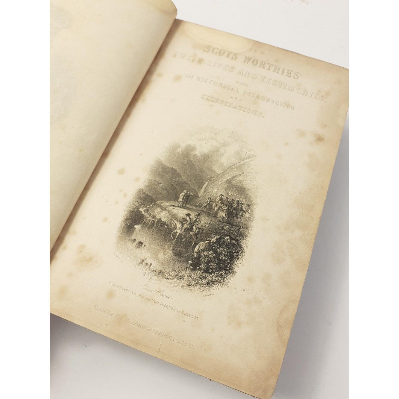 SCOTS WORTHIES: Their Lives and Testimonies with an Historical Introduction and Illustrations by John Howie of Lochgoin, edited by James Howie, published by Blackie & Son 1848, brown cloth cover with leather spine and gilt titles, marbled text block edges, black and white illustrations throughout, some scuff marks to cover and some light foxing