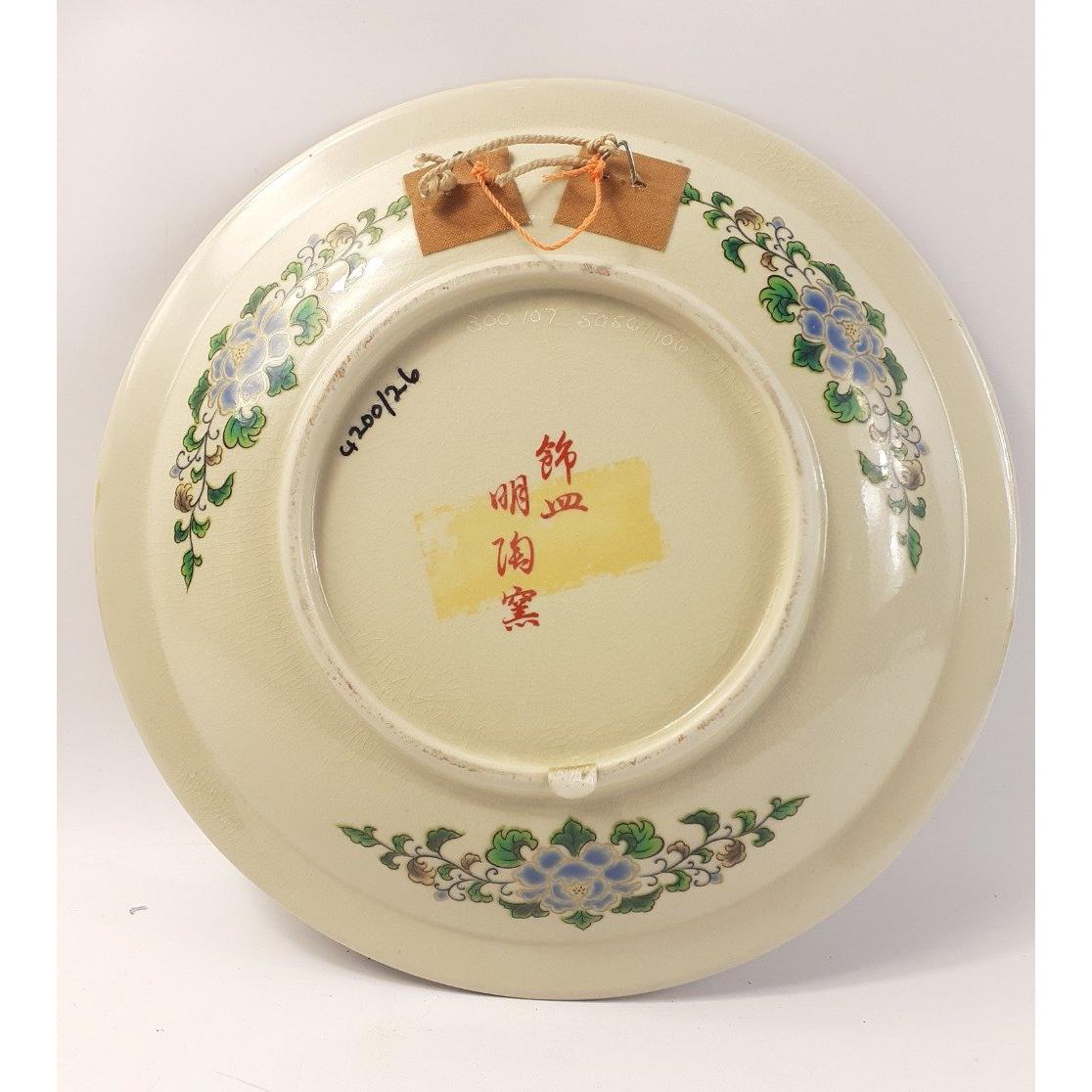 An interesting and colourful far eastern wall plate with peacock and floral decoration. 32cm approx diameter and in good condition