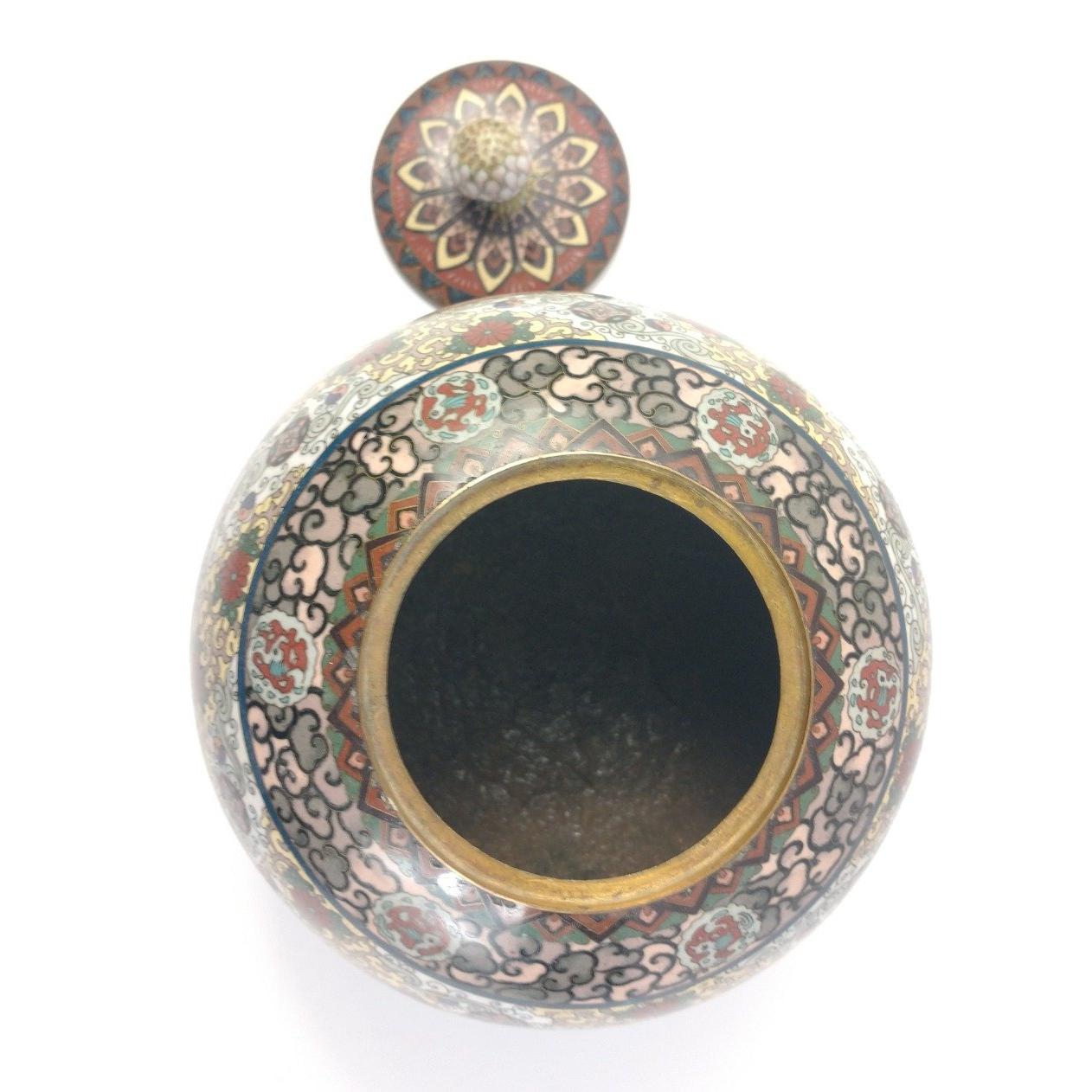 A large cloisonne bowl with lid decorated with stylised dragons and birds of paradise stands approx 19cm H 20cm diameter approx, standing on 3 feet, the finial has been damage repaired but not noticeable without looking closely!
